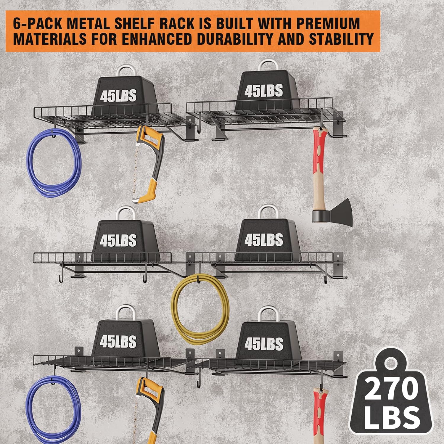 - HEAVY DUTY METAL WALL SHELF: Hanging Garage Shelf is made of high-quality steel with a powder-coated finish for a sturdy structure. After extensive load-bearing testing, each metal rack has a load-bearing capacity of 45 pounds, and 6 metal racks have a load-bearing capacity of 270 pounds, providing a sturdy and secure storage solution for your valuables.