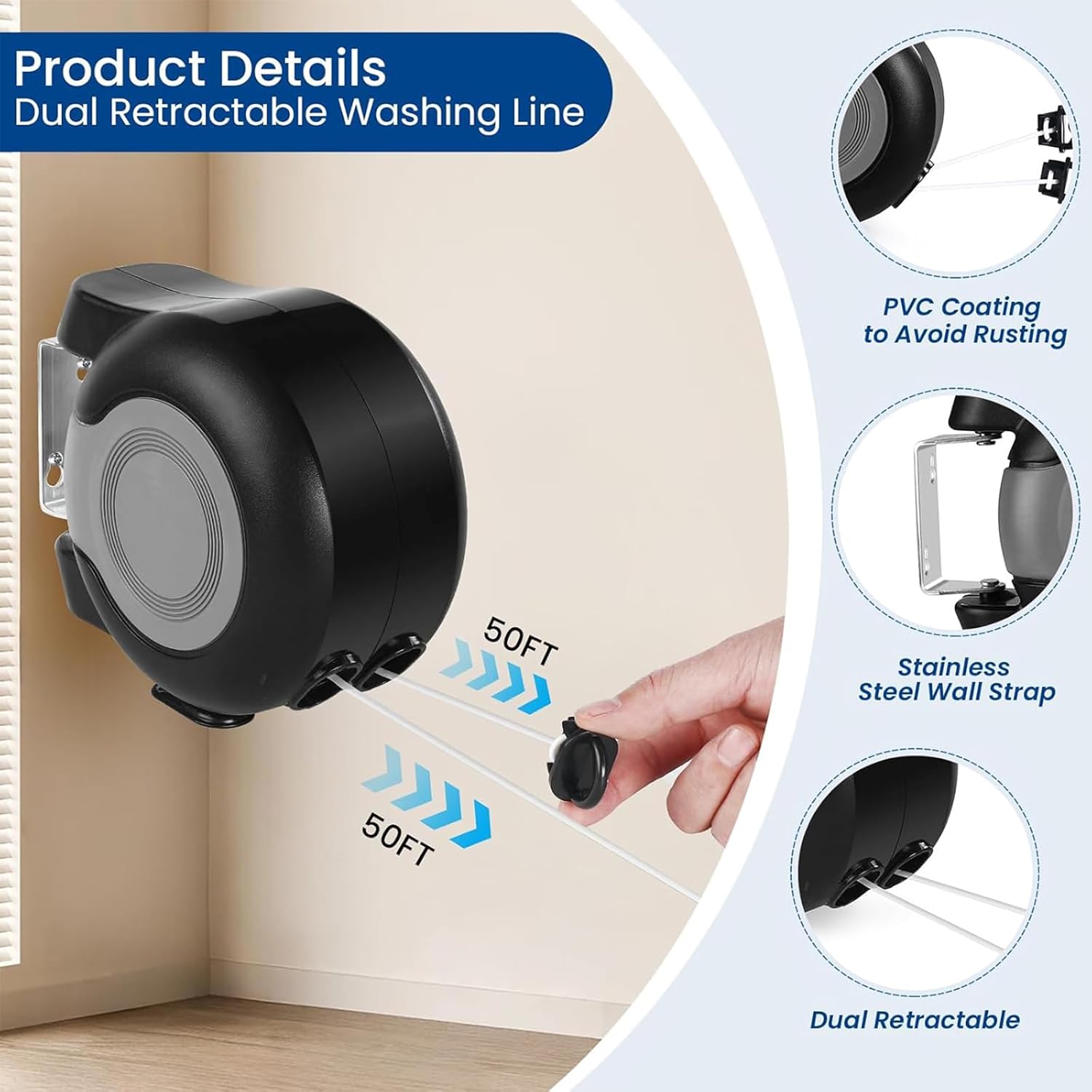 - Dual Retractable Lines for Maximum Drying Space – Enjoy nearly 100 feet of total hanging space with two retractable clotheslines, each measuring approximately 49 feet. Perfect for both indoor and outdoor use—laundry rooms, bathrooms, balconies, backyards, and more.