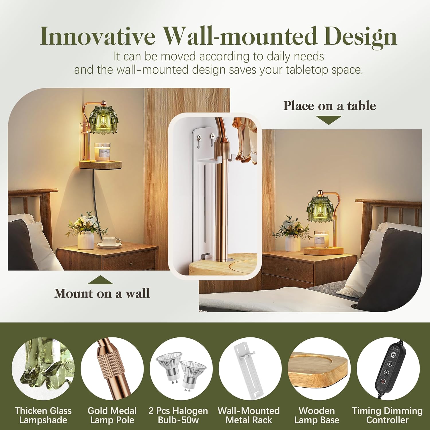 Candle Warmer Lamp with Timer Dimmer, Modern Wax Warmer for Scented Wax Jar Candle Warmer with 2 Bulbs, Adjustable Height Glass Lamp for Gifts for Women, House Warming Gifts, Home Decor, Gold Green