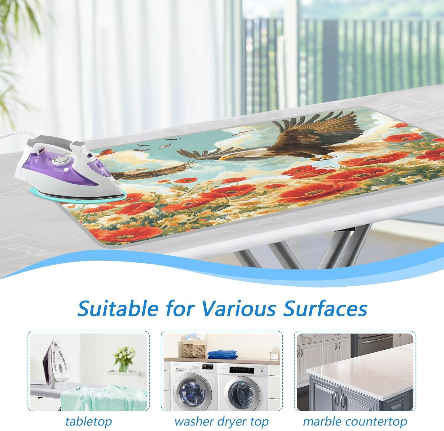 Vivid Poppy Wildflowers and Eagles Ironing Mat Thickened Ironing Blanket Travel Portable Double-Side Using Ironing Pad Travel Isolate Heat Pad Cover for Washer Dryer Table Top Countertop 27.6x4