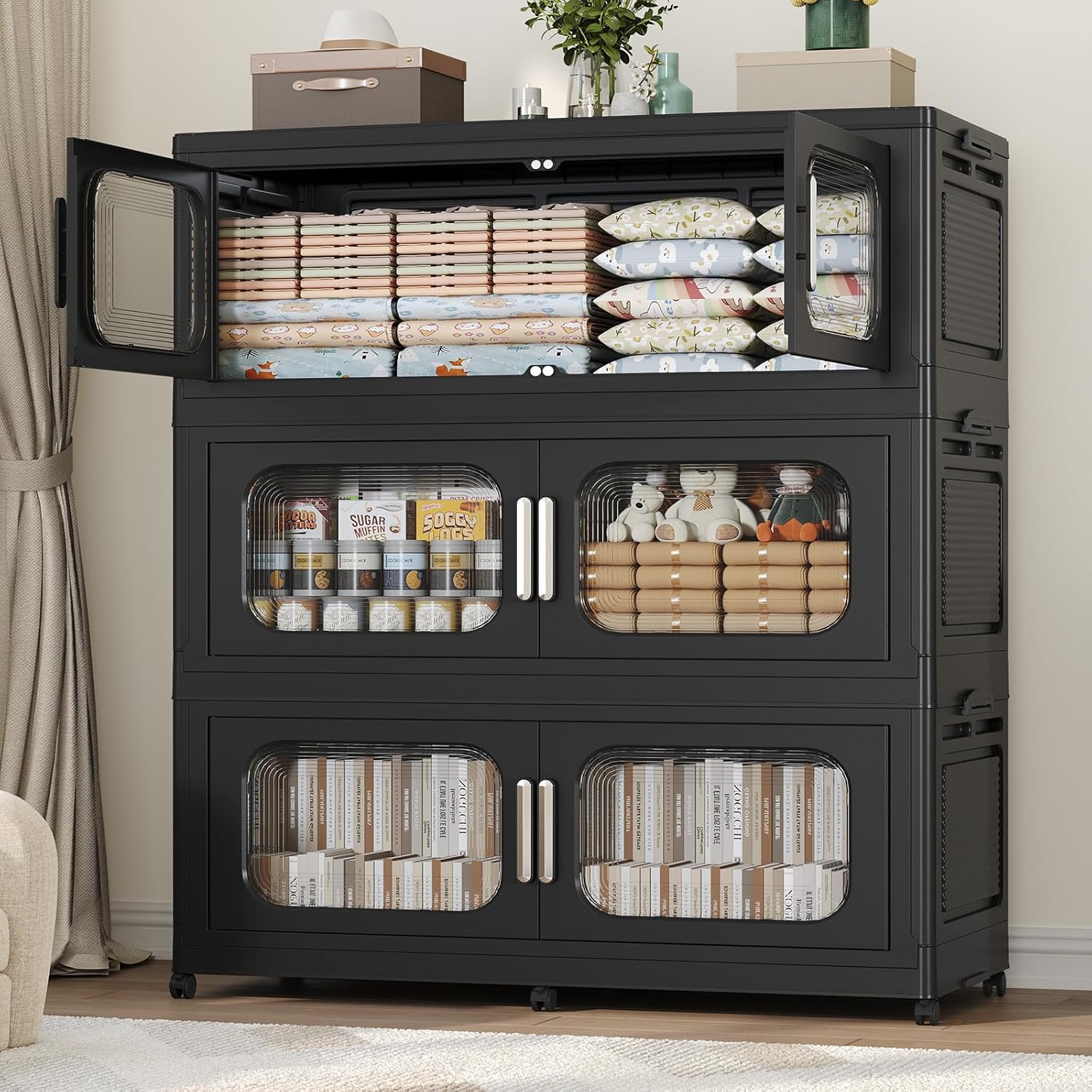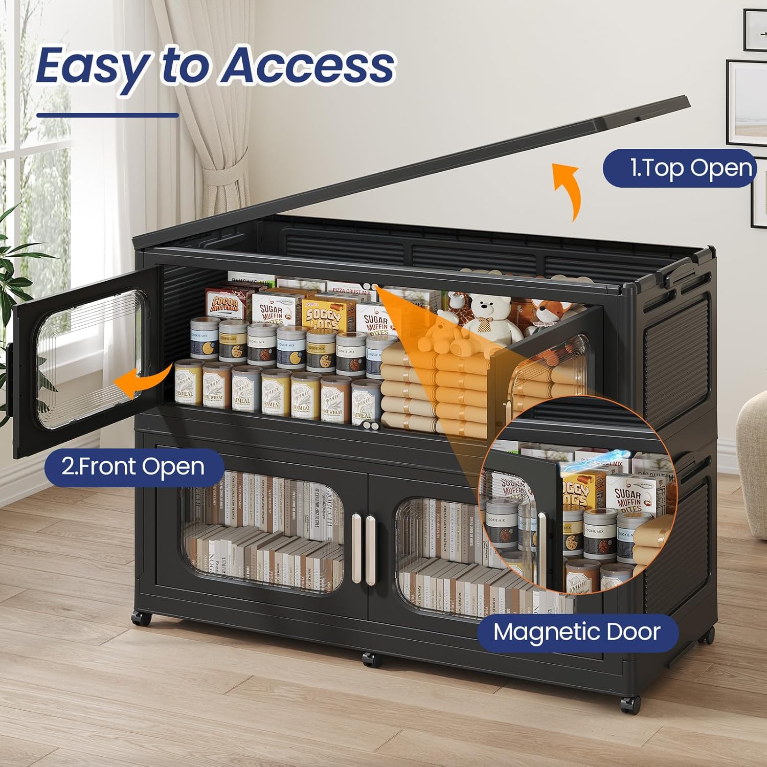 - 【Two Ways to Open & Magnetic Easy Access】The collapsible storage bins with doors and wheels feature a dual access way, allowing for both top and front door openings, and with clear brown windows for easy visibility. The extra large storage bins with open front doors are equipped with magnetic lock buckles to prevent dust from entering the cabinet.