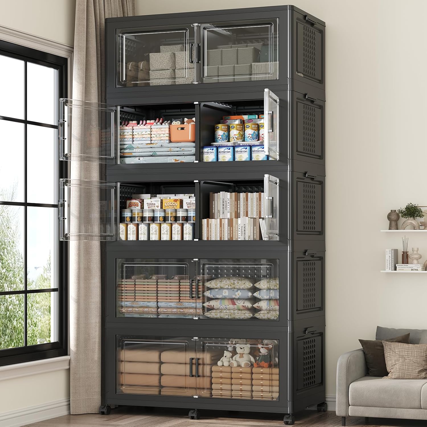 - 【200 Gal Extra Large Storage Bins with Dividers】Our Qavabin black storage cabinet with lid boasts an impressive 40-gallon capacity per tier, totaling 200 gallons across 5 tiers. This foldable storage bins with doors and wheels expands to 29.5''Lx16.5''Wx74''H and supports a maximum weight of 110lb. Each tier includes a divider, allowing for the creation of two separate compartments on one level. PLEASE NOTE: ONLY ONE LID PER SET!!!