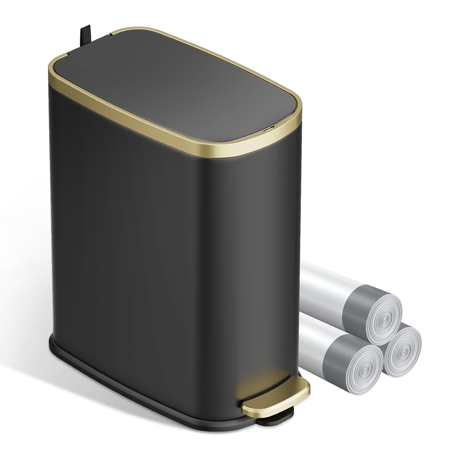KUK Small Bathroom Trash Can with Lid Soft Close, Step Pedal, 2.4 Gal Stainless Steel Garbage Can with Removable Inner Bucket, Anti-Fingerprint Wastebasket for Office, Bedroom, Toilet (Black)