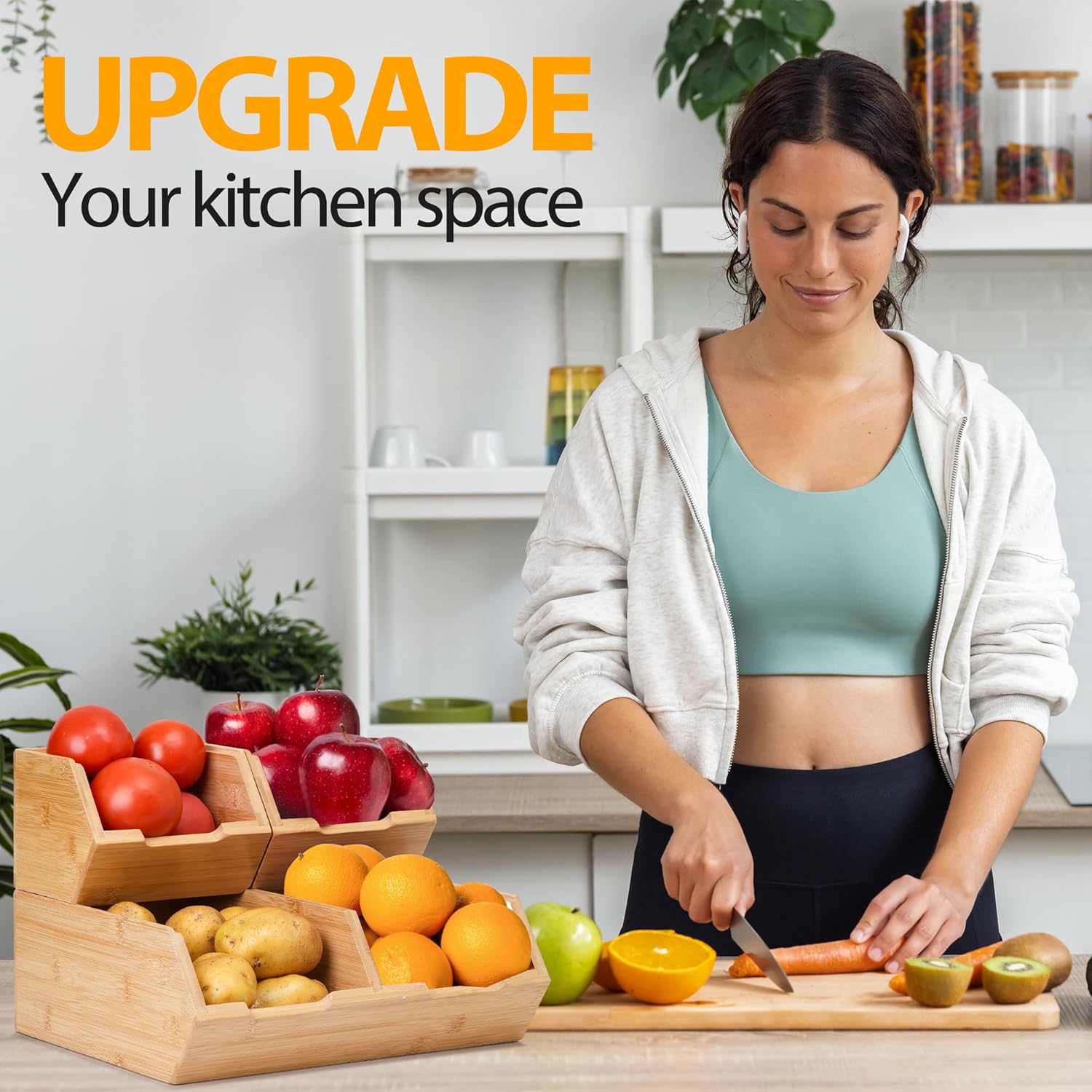 - 1. Premium Bamboo Construction → Our pantry organizers and storage is crafted with **natural sustainable bamboo** , these bamboo pantry bins prevent chemical leaching while resisting moisture and odors—keeping potatoes, onions, and dry goods fresher 30% longer than plastic organizers. Idea for potato and onion storage.