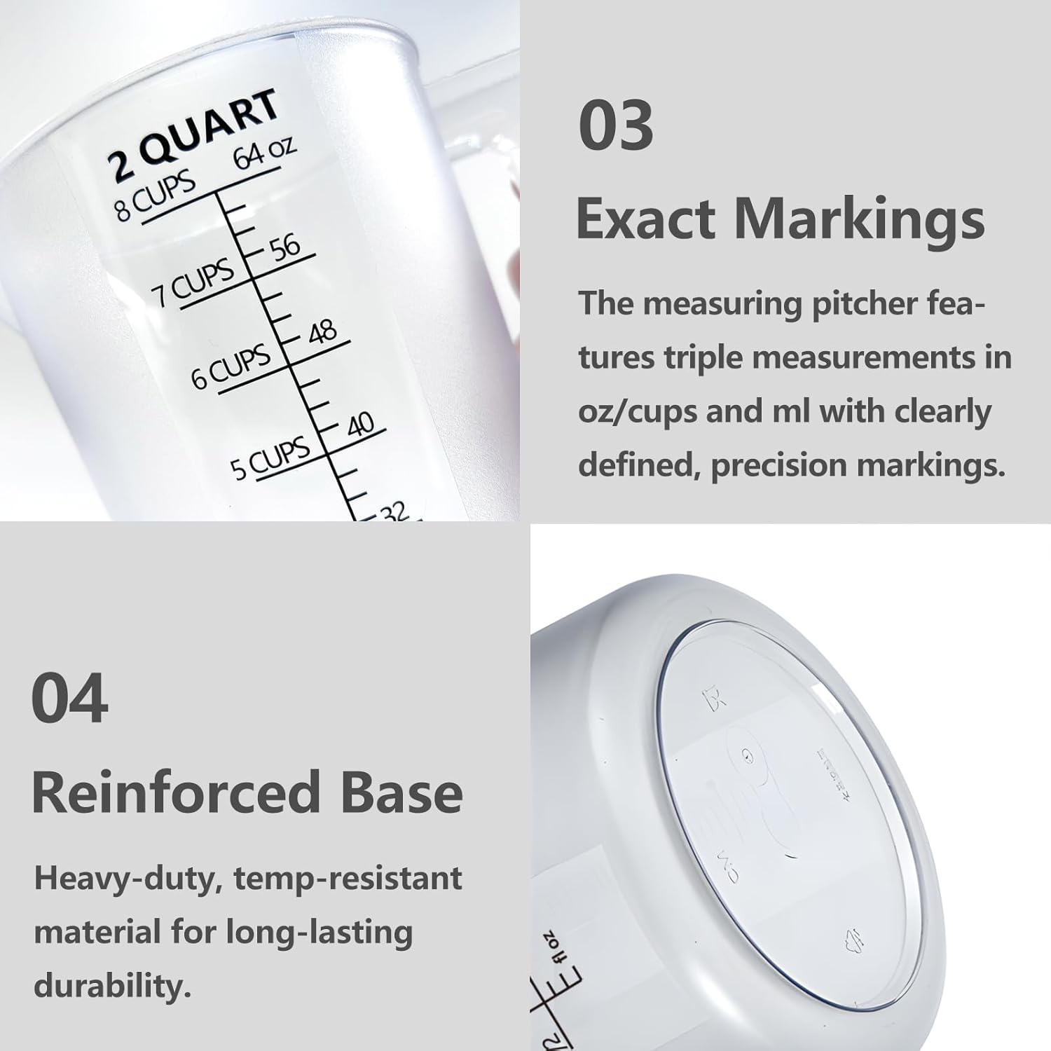 - Precise scale, never fade. Triple scale for precise clarity. The liquid measuring cup features double-sided markings clearly indicating ounces (oz), cups (cup), and milliliters (ml). The wear-resistant, fade-resistant markings ensure precise measurement of formulas, chemicals, or fertilizers, eliminating mistakes.