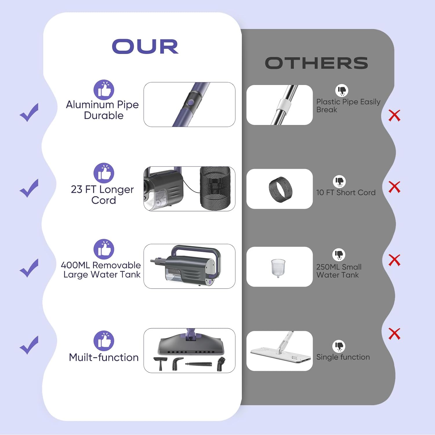 Steam Mop, Steam Cleaner with Large-Capacity Water Tank, 2 Washable Pads, 23FT Power Cable floor steamer, Detachable Steam Mops for Floor Cleaning (Purple)