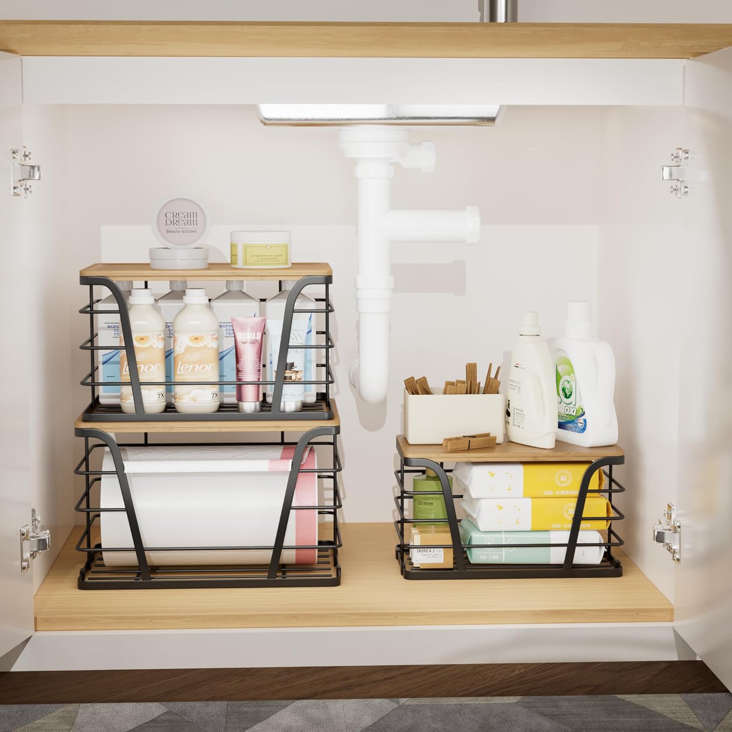 3 Pack Stackable Pantry Organizer, Trash Bag Dispenser Under Sink, Kitchen Organization and Storage, Kitchen Counter Organizer, Black