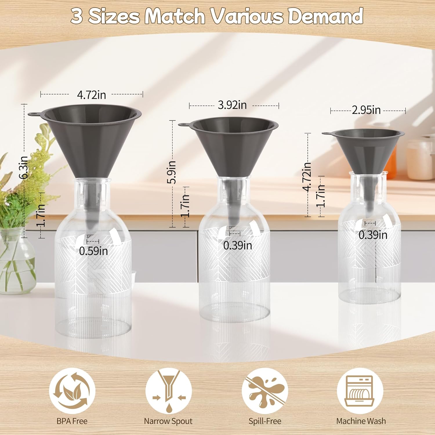 - 【𝐂𝐨𝐦𝐩𝐥𝐞𝐭𝐞 𝐒𝐞𝐭 𝐟𝐨𝐫 𝐃𝐢𝐯𝐞𝐫𝐬𝐞 𝐍𝐞𝐞𝐝𝐬】Our funnel set includes 3 different diameters (4.72inch, 3.92inch, 2.95inch) to meet a wide range of needs. Whether you're transferring liquids or powders, these funnels ensure precise and careful transfers for all your tasks. These kitchen funnels are perfect for filling bottles, jars, and containers, making them ideal for everyday use in the kitchen.