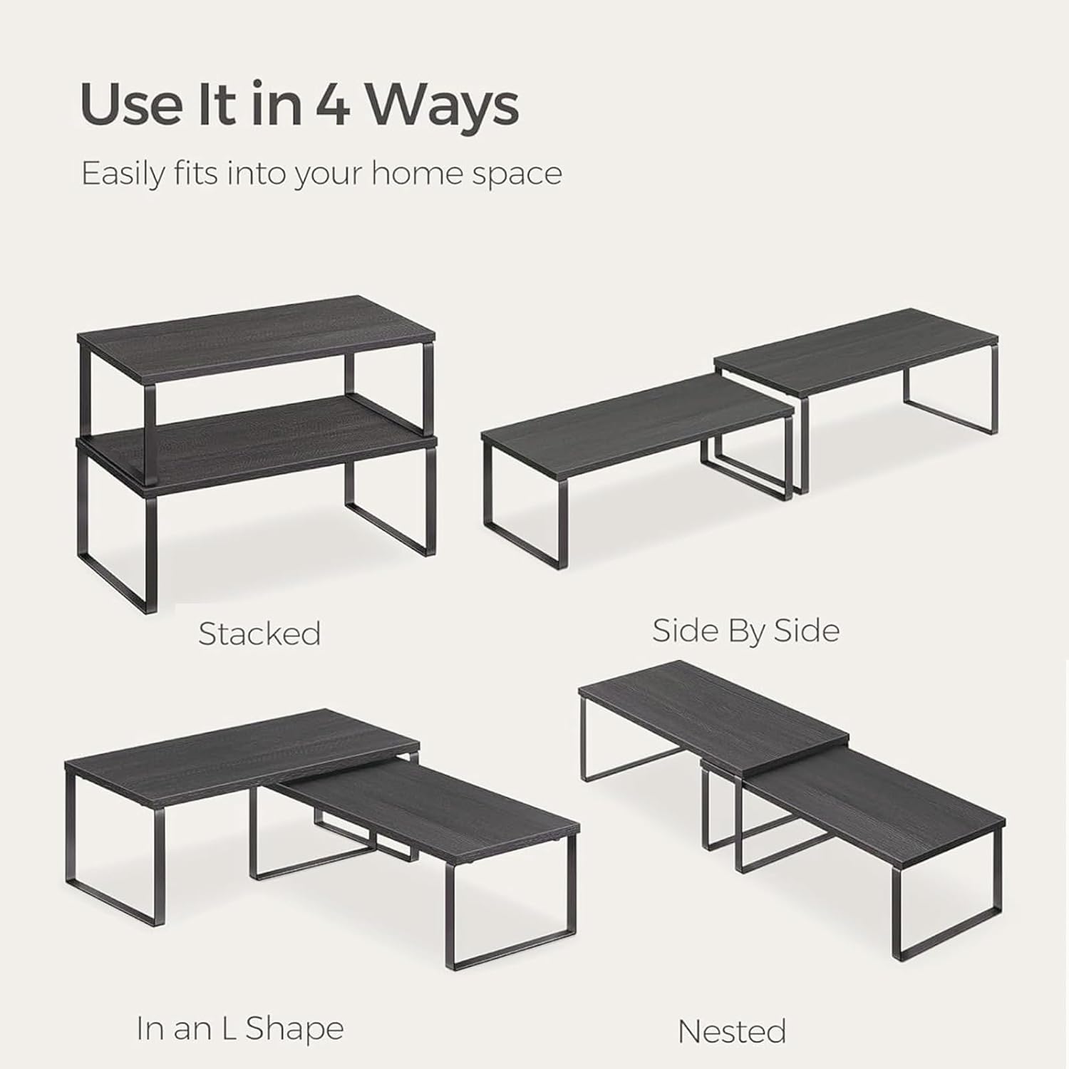 Cabinet Organizer Shelf, Kitchen Counter Storage, 2-Piece Set, Stackable Spice Rack, Metal and Wood (Black and Charcoal Black)