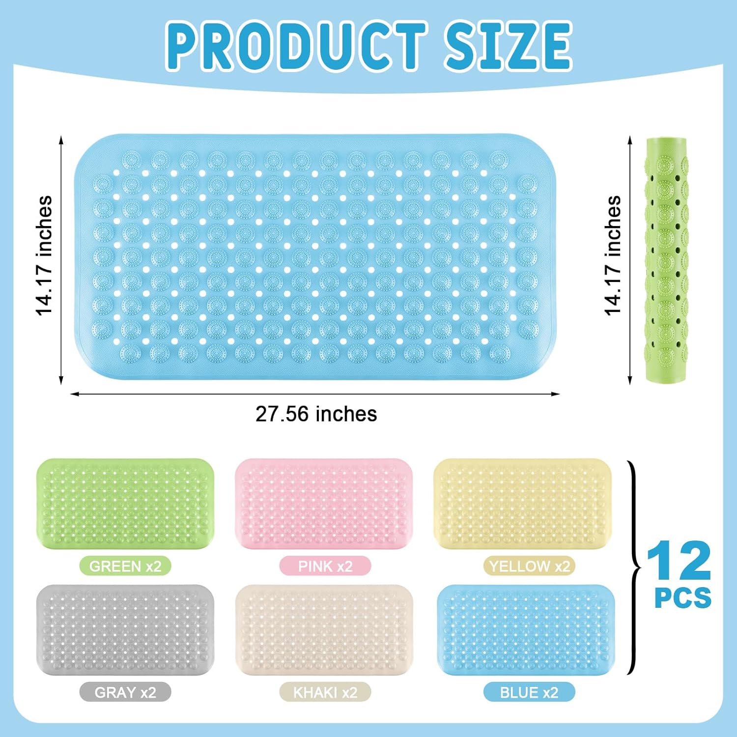 - Generous Bath Mat Set: this practical package includes 12 bath mats in coordinating colors including khaki, dark gray, light green, pink, light yellow, navy blue, enough to outfit multiple bathrooms or rotate for frequent replacement; Each shower mat features identical quality construction with pebble textured surfaces and secure suction cups; The multi pack design offers exceptional value for households with multiple bathrooms or families needing regular mat replacements
