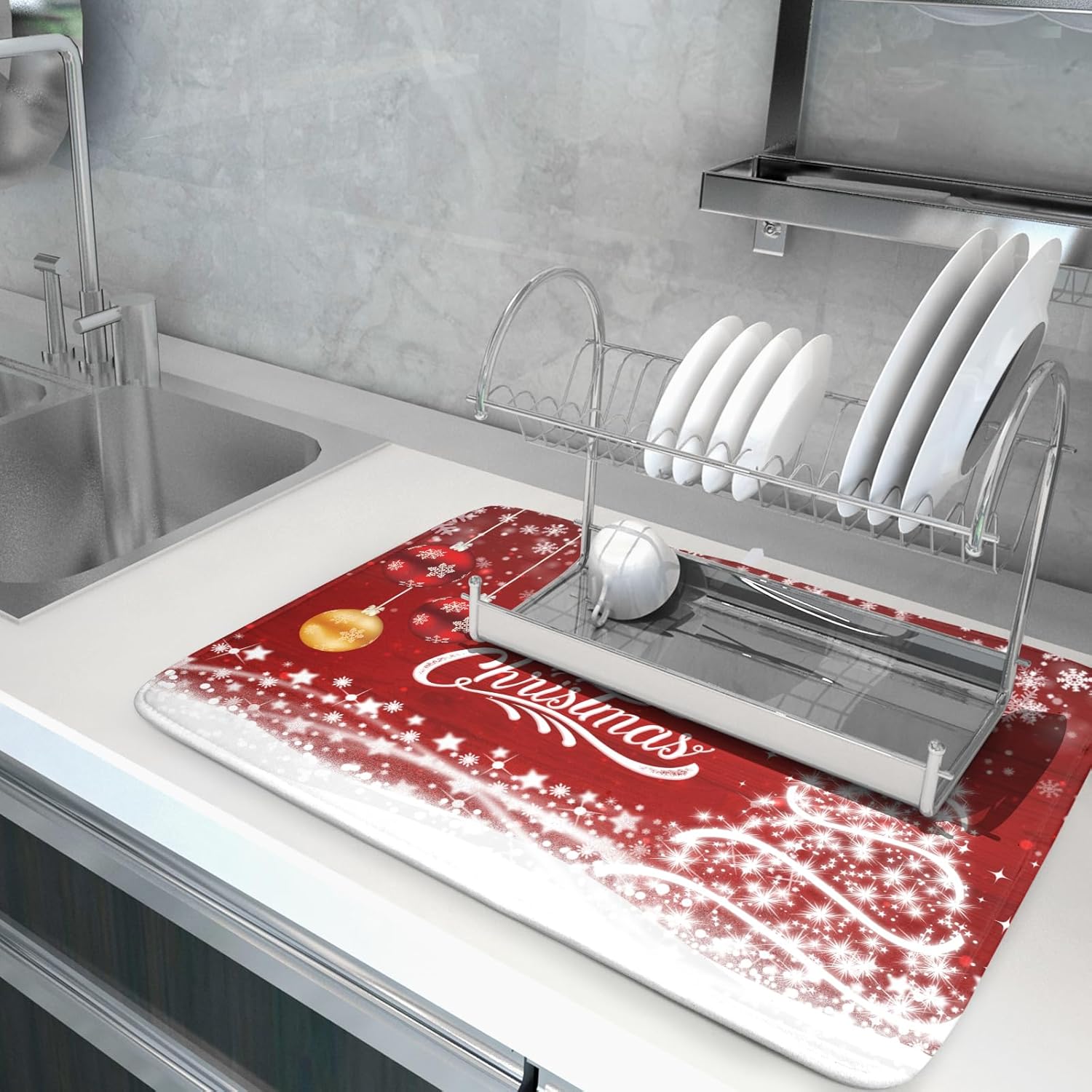- 【Premium Material】The Christmas snowflake on red dish drying mat is made of high-quality polyester surface material, and the middle is composite sponge material, provides a soft protective cushion. The backing with reversible superfine fiber can absorb water several times heavier than itself, which quickly absorbs water, stops liquids from soaking through, keep the kitchen countertop dry and clean. The dish drying mat can been double-sided uses with strong edging, not easy to disperse.