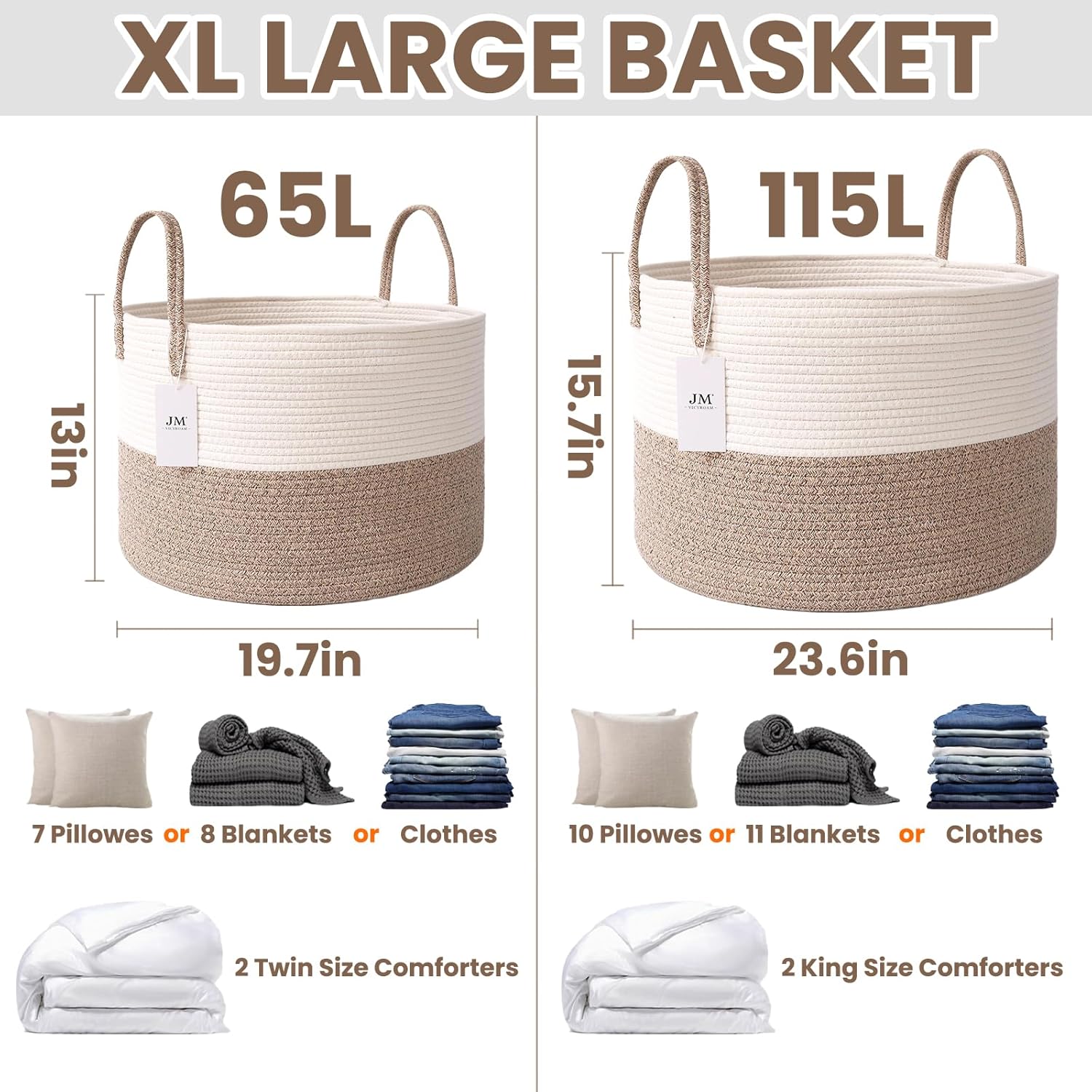Woven Blanket Basket,65L Large Rope Storage Bin with Handles, Organizer for Blankets Toys Book and Clothes, Laundry Basket for Living Room Bedroom Nursery,White&Brown