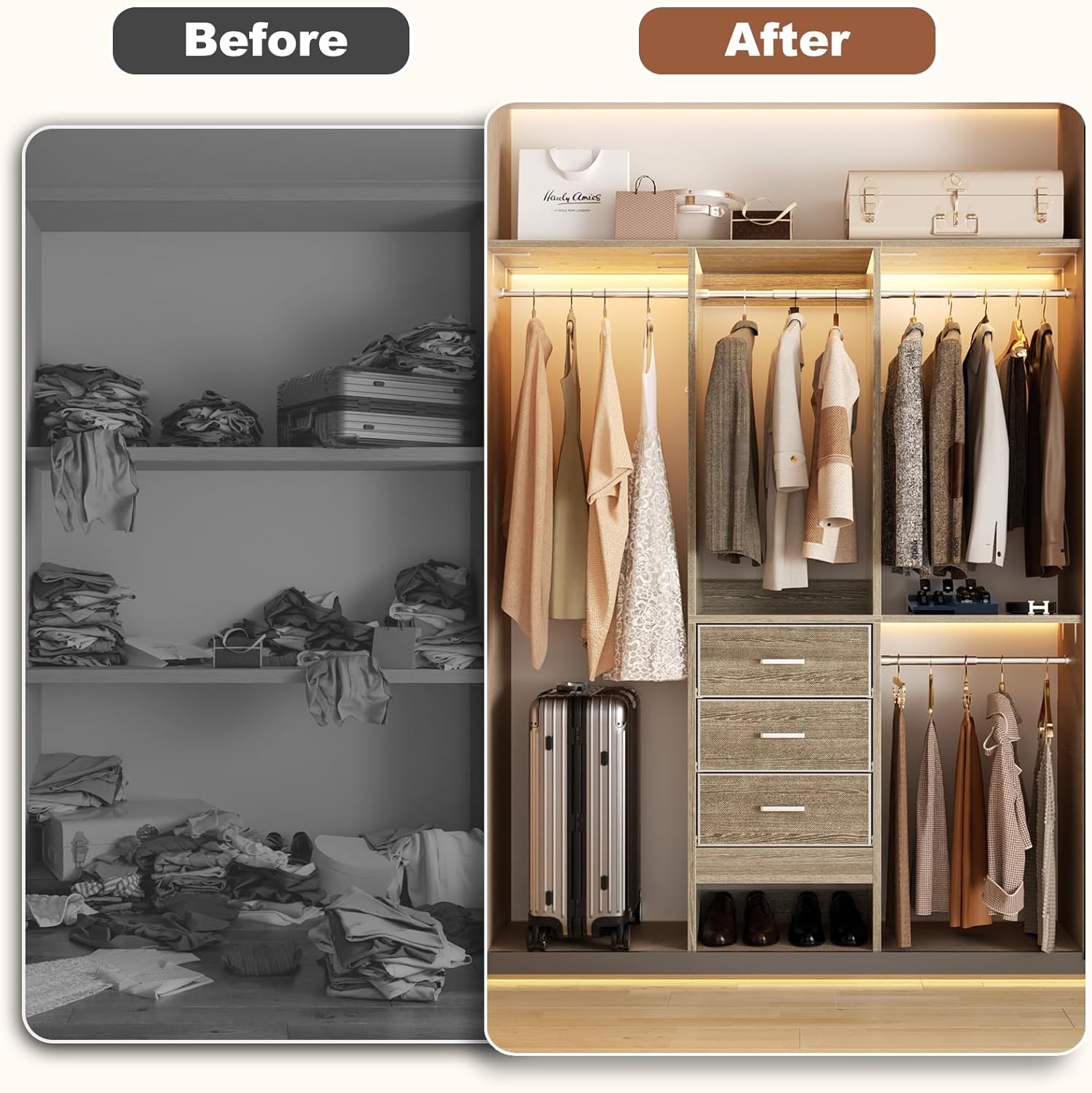 4FT Small Closet System with 3 Fabric Drawers, 48'' Closet Organizer System With 3 Adjustable Shelves, Flexible Built-In Clothes Garment Rack for Small Space, 48"L x 13"W x 71"H, White Oak