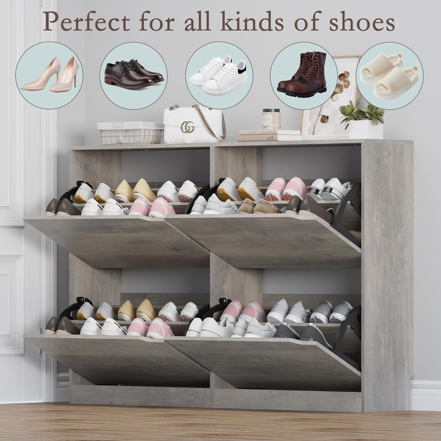 - Customizable Storage with Adjustable & Removable Panels: Each of the four flip-out drawers includes a 2-tier shoe organizer with adjustable dividers. The removable panels allow you to store various types of shoes—sneakers, high heels, flats, ankle boots, or even slippers. With deep compartments and tilt-out doors, this tall shoe storage cabinet keeps your favorite pairs visible and accessible.