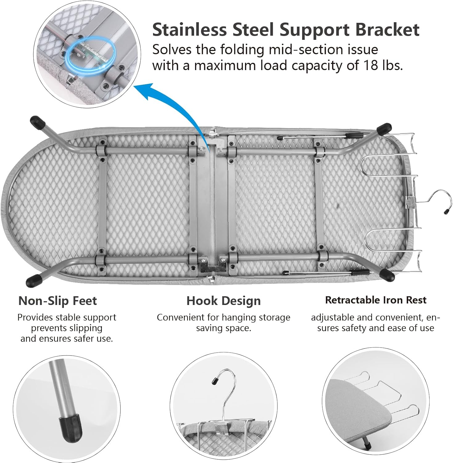 - 【Built to Stay Steady】Features reinforced steel construction that supports up to 18 lbs—5 lbs more than most tabletop boards. The sturdy frame won’t wobble, even when pressing heavier items like jeans or jackets