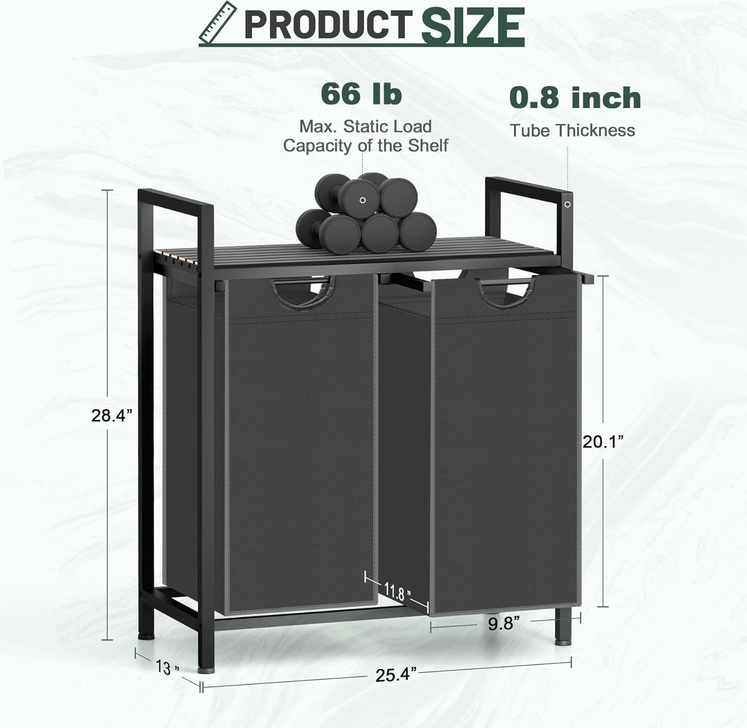 - 2 Removable Bags - The laundry hamper has a total capacity of 20 gallons, with each liner holding 10 gallons. Its 2 compartment design enables you to organize your laundry by type and separate light laundry from different family members.