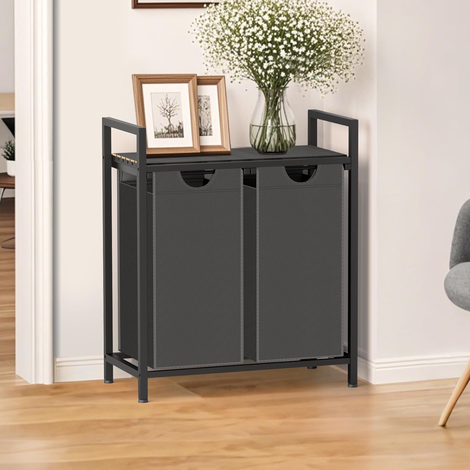 - Construction Design - With 4 adjustable feet, you will not have to worry about stability, and it is also adaptable to different spaces. Adjustable feet protect your floor from scratches. Strong steel frame and water-resistant wood top offer stable support. This laundry hamper comes with detailed instructions manual and all hardware needed, it is easy to assemble.