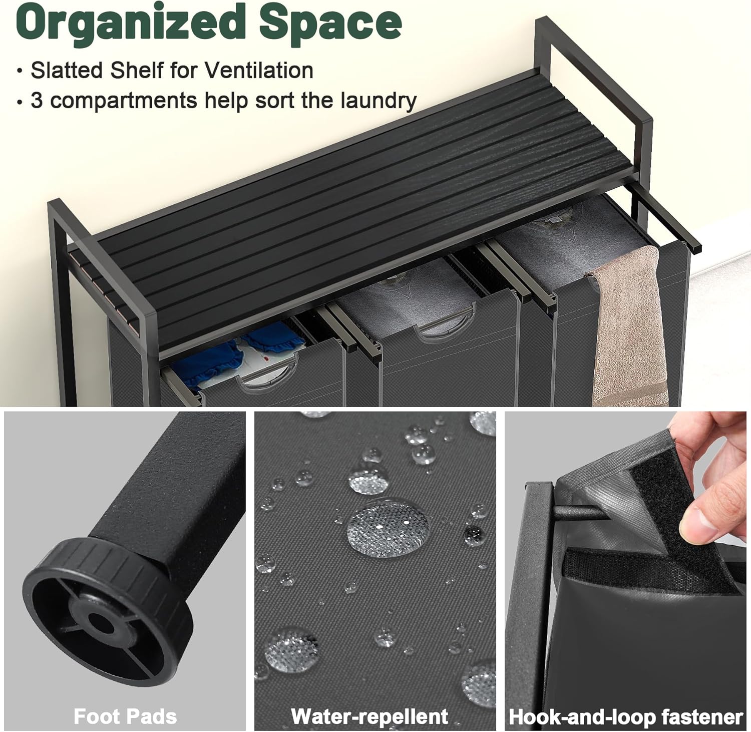 Laundry Hamper, Laundry Sorter with 3 Pull-Out Removable Oxford Fabric Bags Cloth Laundry Basket 3 x 10 Gallons (Grey and Charcoal Black)