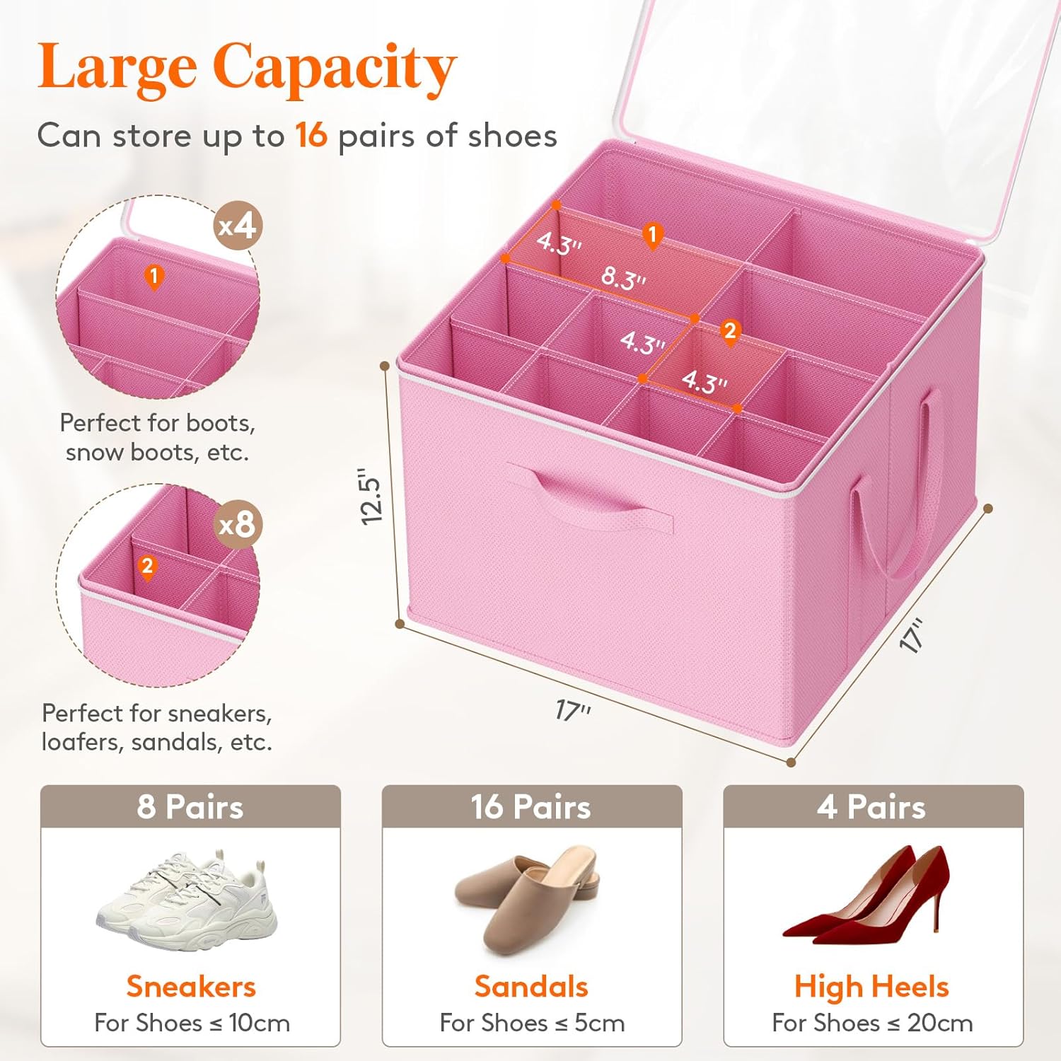Lifewit Shoe Storage Organizer for Closet Fits 12-16 Pairs, Fabric Large Shoe Box Storage Containers with Clear Cover, Foldable Bins Fit for Boots Heels Sneakers 17"(L) x 17"(W) x 12.5"(H) 3 Pack Pink