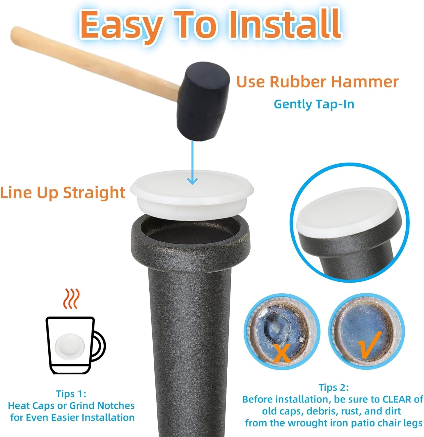 - Easy Installation, 24 Pack Value – Includes 24 patio chair feet caps for replacement glide caps of 6 chairs. Before installation, be sure to CLEAR of old caps, debris, rust, and dirt from the wrought iron patio chair legs, then tap the caps in with a rubber mallet. For even easier installation, heating the caps or grinding notches before fitting is recommended. These outdoor chair leg floor protectors provide lasting protection season after season.