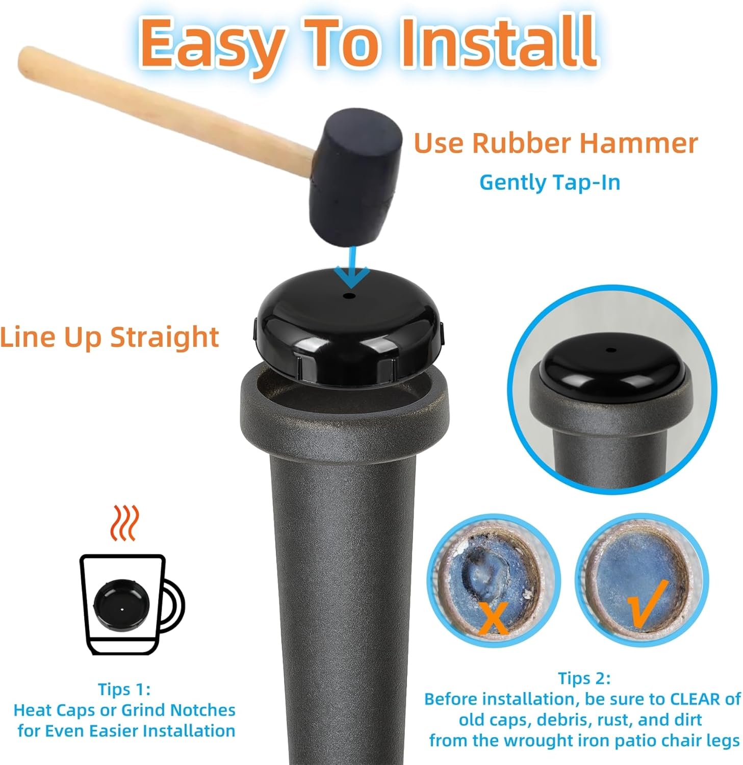 - Easy Installation, 24 Pack Value – Includes 24 patio chair feet caps for replacement glide caps of 6 chairs. Before installation, be sure to CLEAR of old caps, debris, rust, and dirt from the wrought iron patio chair legs, then tap the caps in with a rubber mallet. For even easier installation, heating the caps or grinding notches before fitting is recommended. These outdoor chair leg floor protectors provide lasting protection season after season.