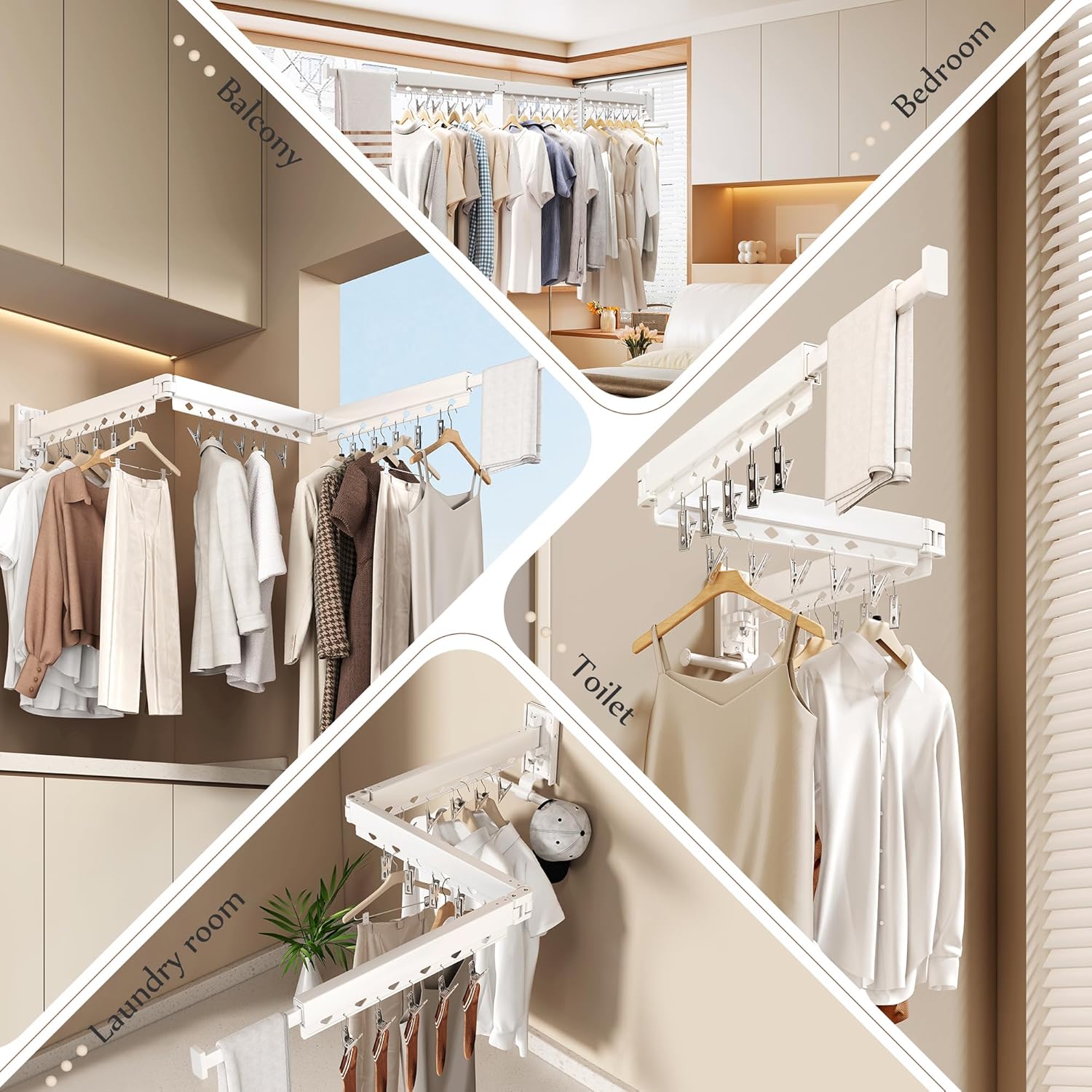 - Windproof Design with Clips & Holes: Equipped with 18 windproof holes and 15 clips, this upgraded wall mounted clothes drying rack keeps clothes, socks, and small items secure even on windy days, making laundry more convenient.