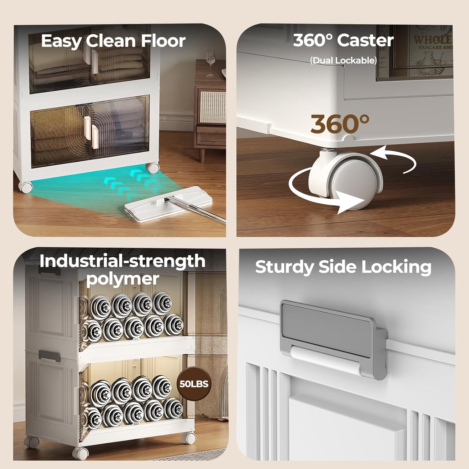 - Stackable & Foldable: No tools needed—assemble in under 3 minutes! Features 2 reinforced latches on each side for secure stacking and stability. Bins fold flat when not in use for compact storage under beds or in car trunks. (Each package includes one lid for top cover only.)