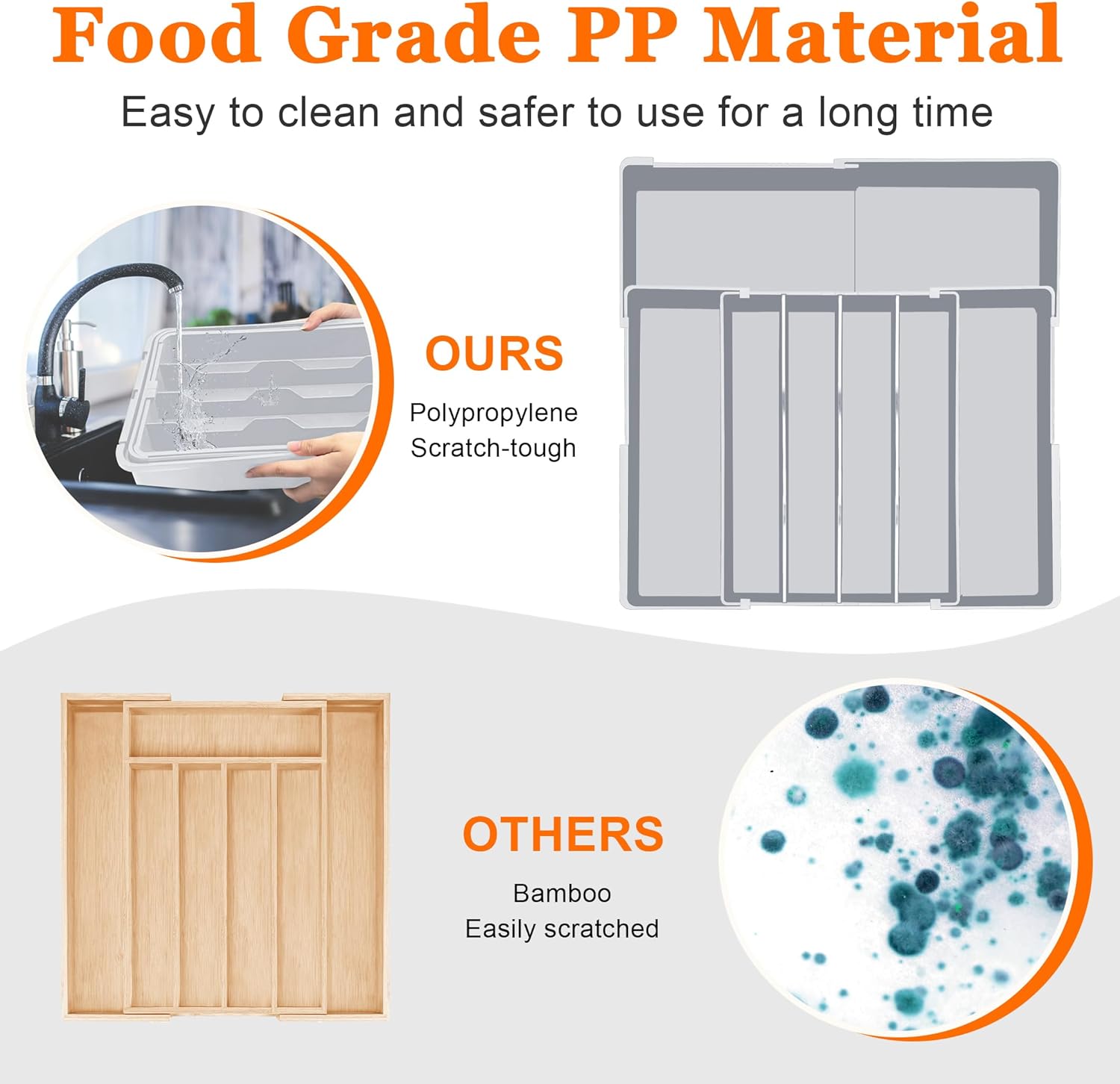 - 【Premium Food Grade Material for Safety】: Crafted from thick, sturdy food-grade PP material, our utensil drawer organizer is built to last. It’s also BPA-free, ensuring that your kitchen utensils stay safe for your family’s health. Cleaning is a breeze—simply rinse with water or wipe with a cloth. Just avoid the dishwasher to keep your flatware organizer for drawer in top condition!