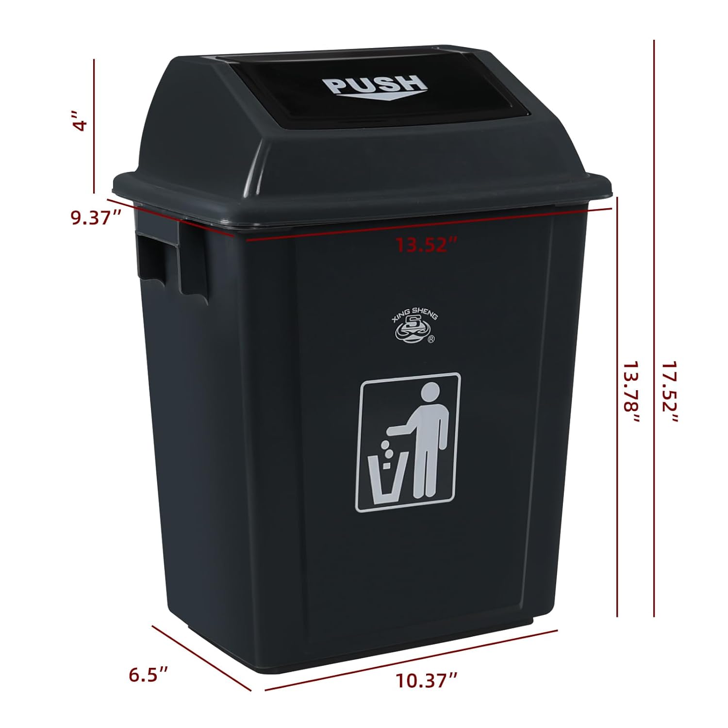 - Top size: 13.52" x 9.37", bottom size: 10.37" x 6.5", height: 17.52", with a capacity of 8 gallons