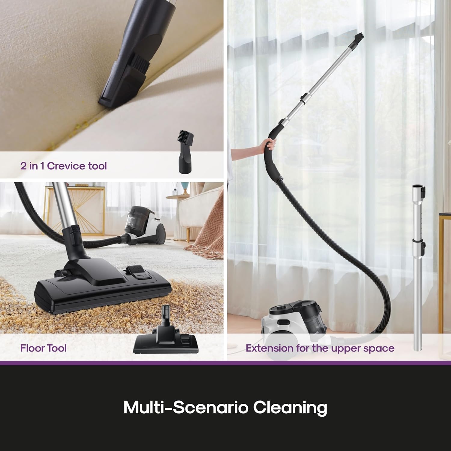 - Innovative Multi-Surface vacuum: Deep clean with the whirlwind canister vacuum.This vacuum features an integrated airflow control on the handle that can be easily switched at your fingertips.Dust cup capacity - 1.2 liters.Voltage:120 volts.Noise Level: ≤82 dBA