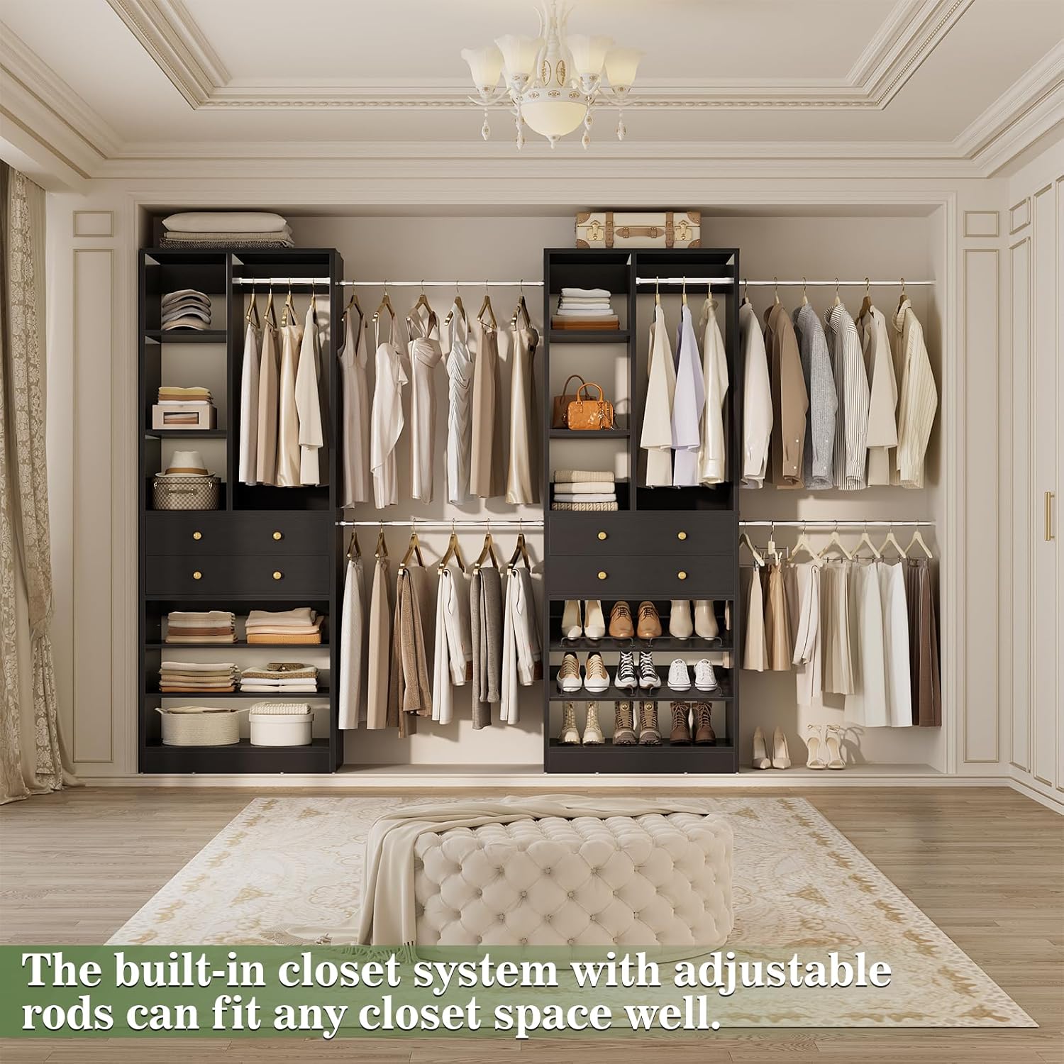 Closet System, Up to 134"/11.2 FT Closet Organizer with 4 Wooden Drawers and Shelves, Walk-in Closet System with 6 Hanging Rods, Built-in Closet Can Fit 96"/8FT, 120"/10FT, Black