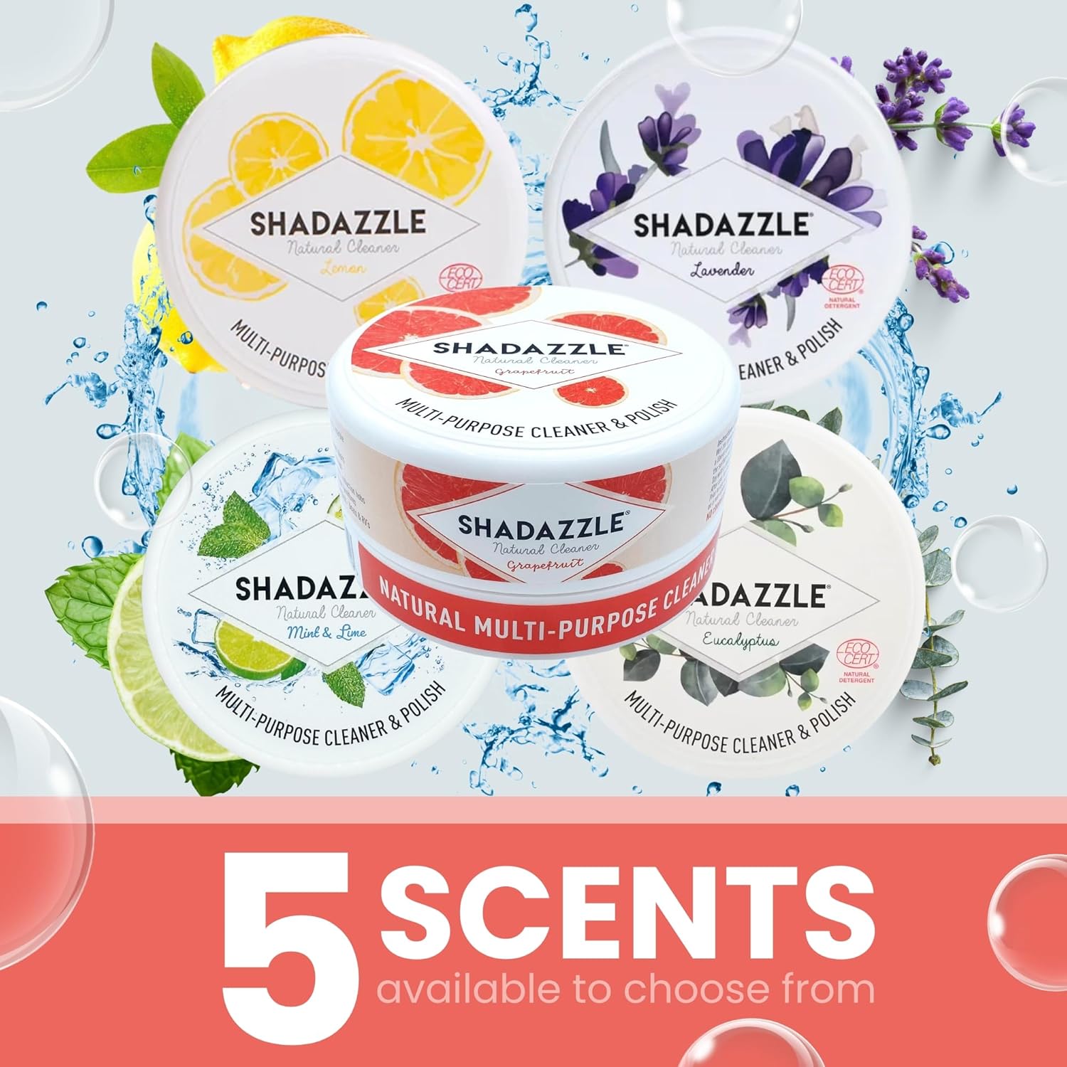 - NATURAL ALL PURPOSE CLEANER : Shadazzle is a multi purpose cleaner that works on any washable surface. It is made with natural ingredients only : clay, vegetal oil, vegetal glycerin, grapefruit fragrance. No harmful chemicals or phosphates !