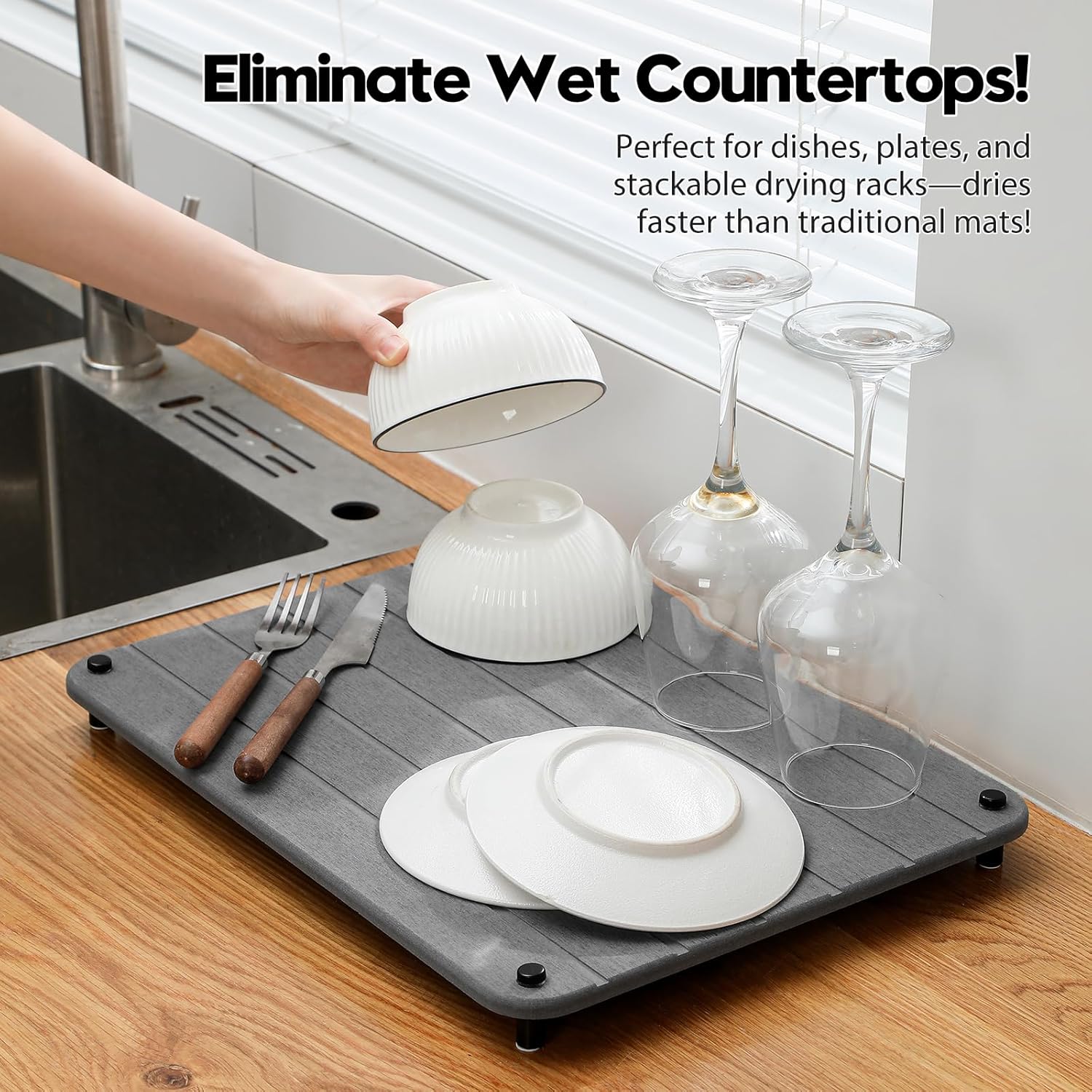 Stone Dish Drying Mat for Kitchen Counter, Water Absorbing Bathroom Tray Sink Organizer, Diatomaceous Earth Countertop Dish Rack Riser Sponge Holder Soap Dish, Dark Gray, 16" x 12"