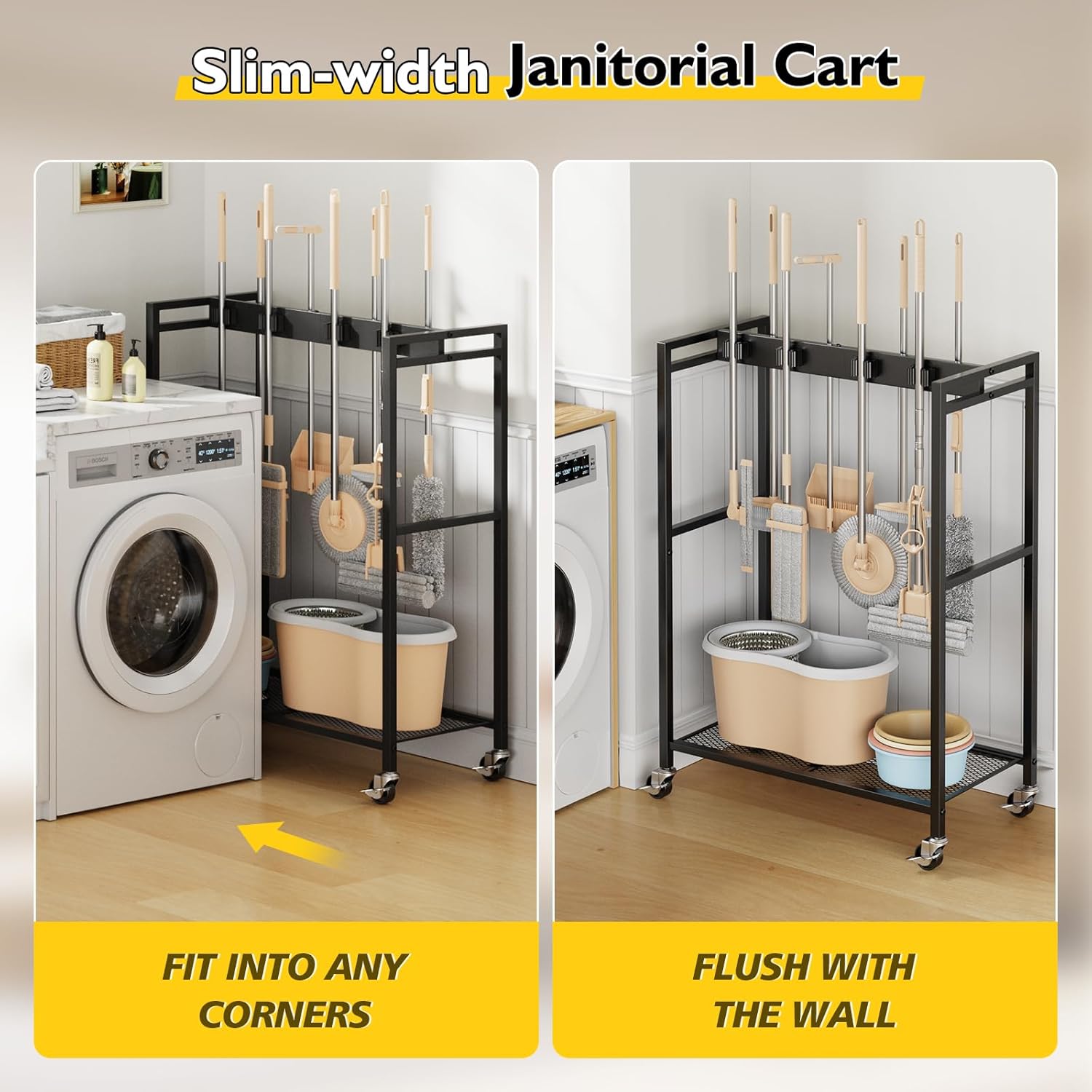BORISI Broom And Mop Holder, Movable Broom Closet Storage Cabinet, Cleaning Cart with Mop Hanger Gripper Rack, Janitorial Cart, Utility Carts, Laundry Room Organization Home Essentials