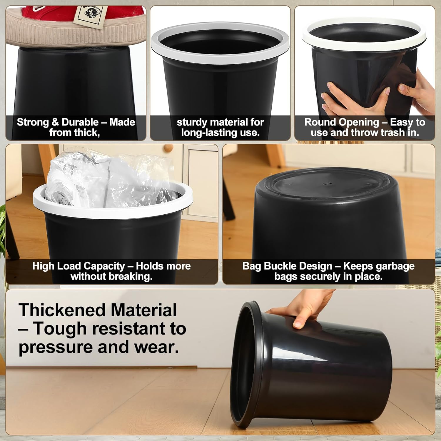 - Sturdy and Durable: these small round trash cans are made of quality plastic material with appropriate thickness, reliable material, exquisite workmanship, light weight but sturdy, not easy to wear, deform or break, allowing you to use it with confidence