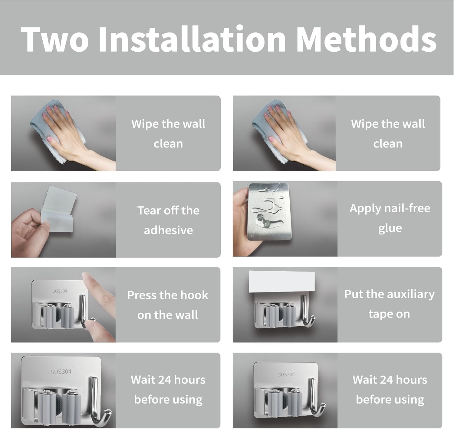 - Nail free and Wall Protect: Two installation methods: Install with adhesive tape or Glue. First method is Self Adhesive broom hanger keep no drilling holes in the wall. It is Suitable for small items, brooms, mops, Umbrellas, Toilet Brushes, etc. Note that this method only applies to Marble, Smooth Tiles, Glass, Wooden Board, Metal Panel, Acrylic Plate. Adhesive holder load-bearing capacity reaches 3kg.