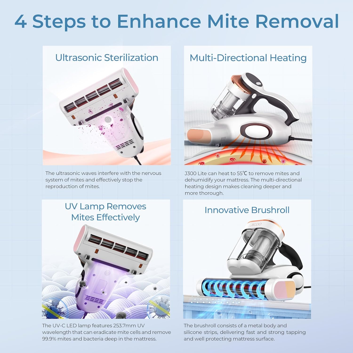 - More Than 99% Protection: Equipped with UV lights and ultrasonic technology, JIGOO J300 Lite mattress vacuum uses 253.7nm ultraviolet rays and ultrasonic waves to eliminate various, ensuring the health of your family.