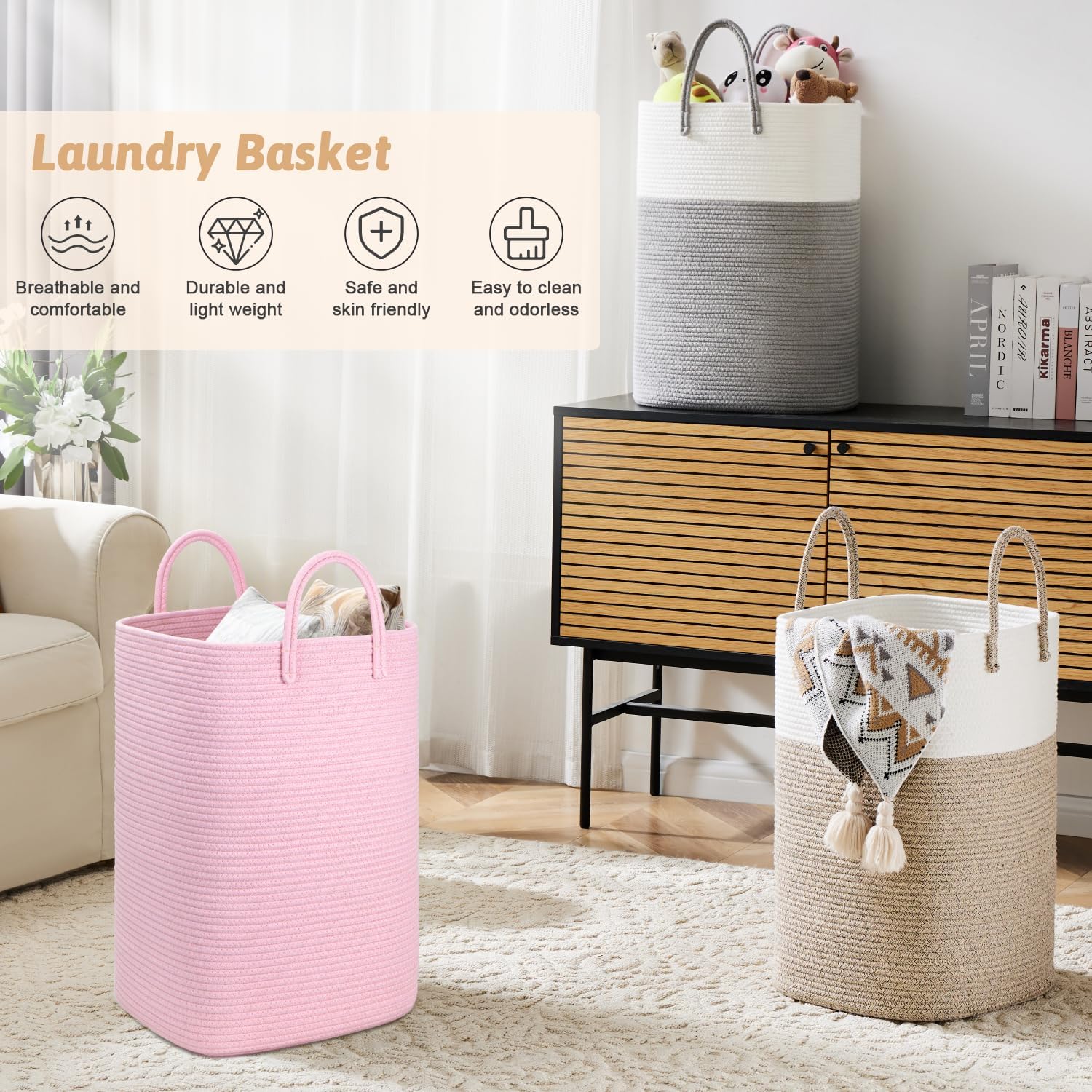 - 🌻【Elegant Natural Charm】 The stylish design of our cotton rope laundry basket brings a touch of natural elegance to your home decor.It seamlessly blends with any room and serves as an eye-catching decorative piece.It's the perfect gift choice for enhancing the beauty of homes,adding a touch of sophistication.
