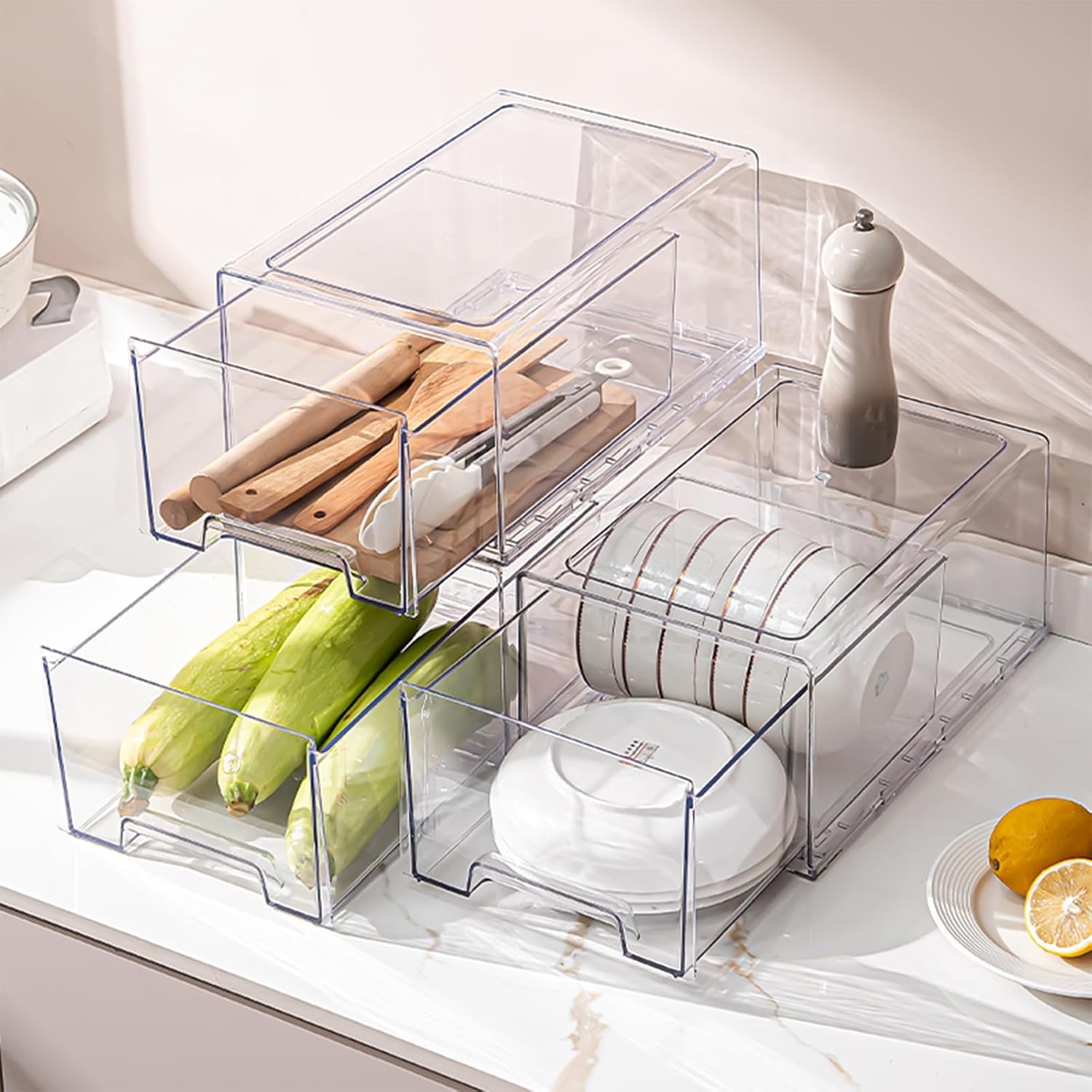 PeJeyiee Clear Stackable Refrigerator Organizers and Storage Drawers - Pull-Out Fridge Bins with Anti-Slip Base & Easy Clean, Plastic Organizers for Kitchen Pantry Cabinet Closet (2XL)