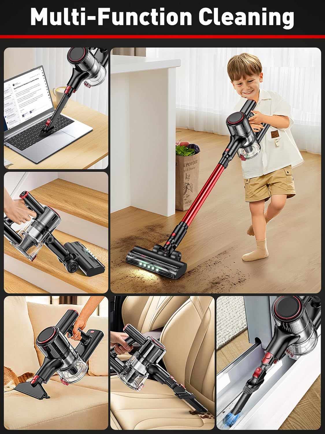 - [LED Display with Blockage Alerts] The intuitive LED screen shows battery status, suction level, and blockage alerts in real time. In order to prevent accidental touches, this cordless vacuum have designed user-friendly physical button switches and suction power adjustments.Keep your cleaning under control with just a glance—perfect for busy families.