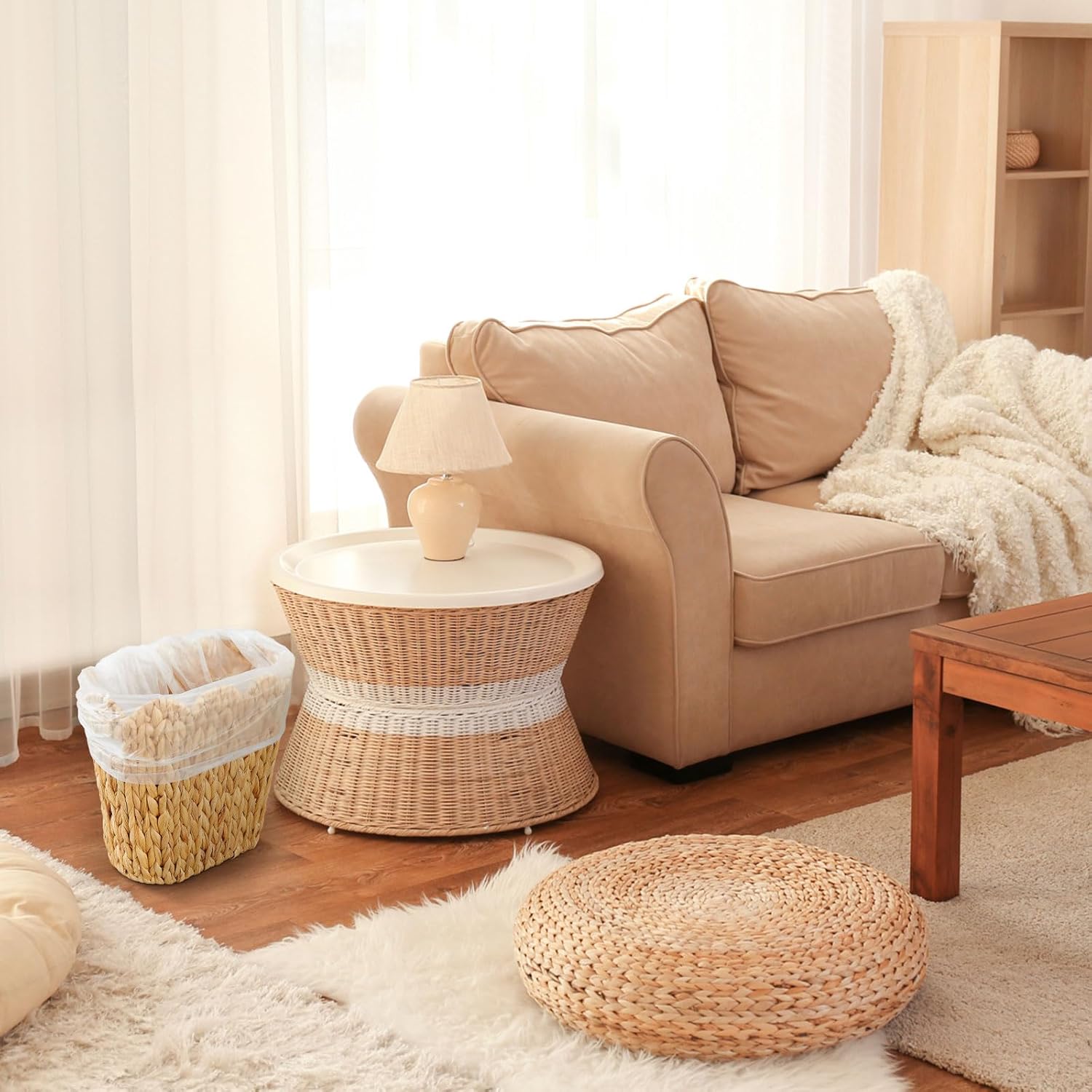 - Convenient Package: the set includes 2 wicker trash baskets along with a roll of 50 garbage bags; This thoughtful combination provides a ready to use solution for your waste management requirements at different spots in your home or office