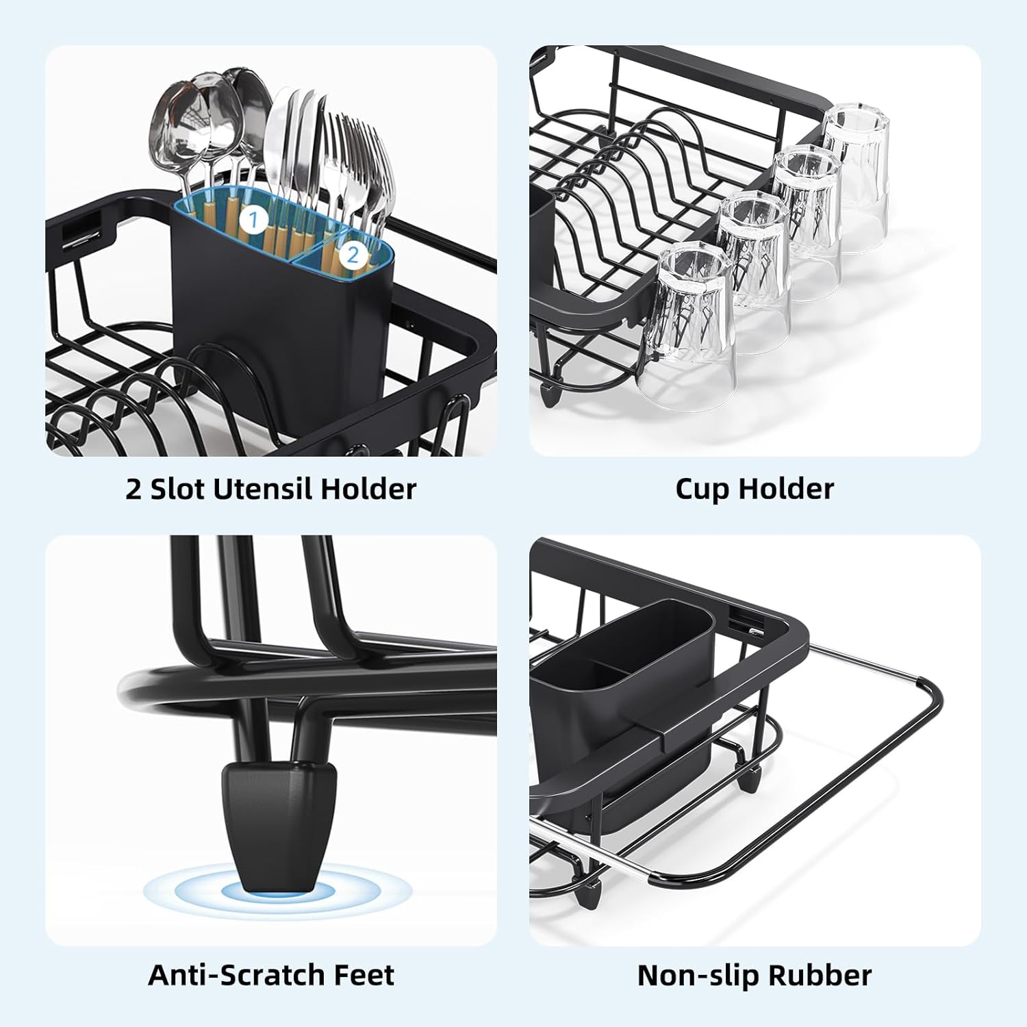 - [ 6 IN 1 MULTIFUNCTIONAL ] Urackify sink dish drainer includes a 2-grid utensil holder, rack for storing 8 dishes, 1 cutting board, 8 Glasses, fruits and vegetables. You can have your various tableware well-organized with Urackify in sink dish drying rack.