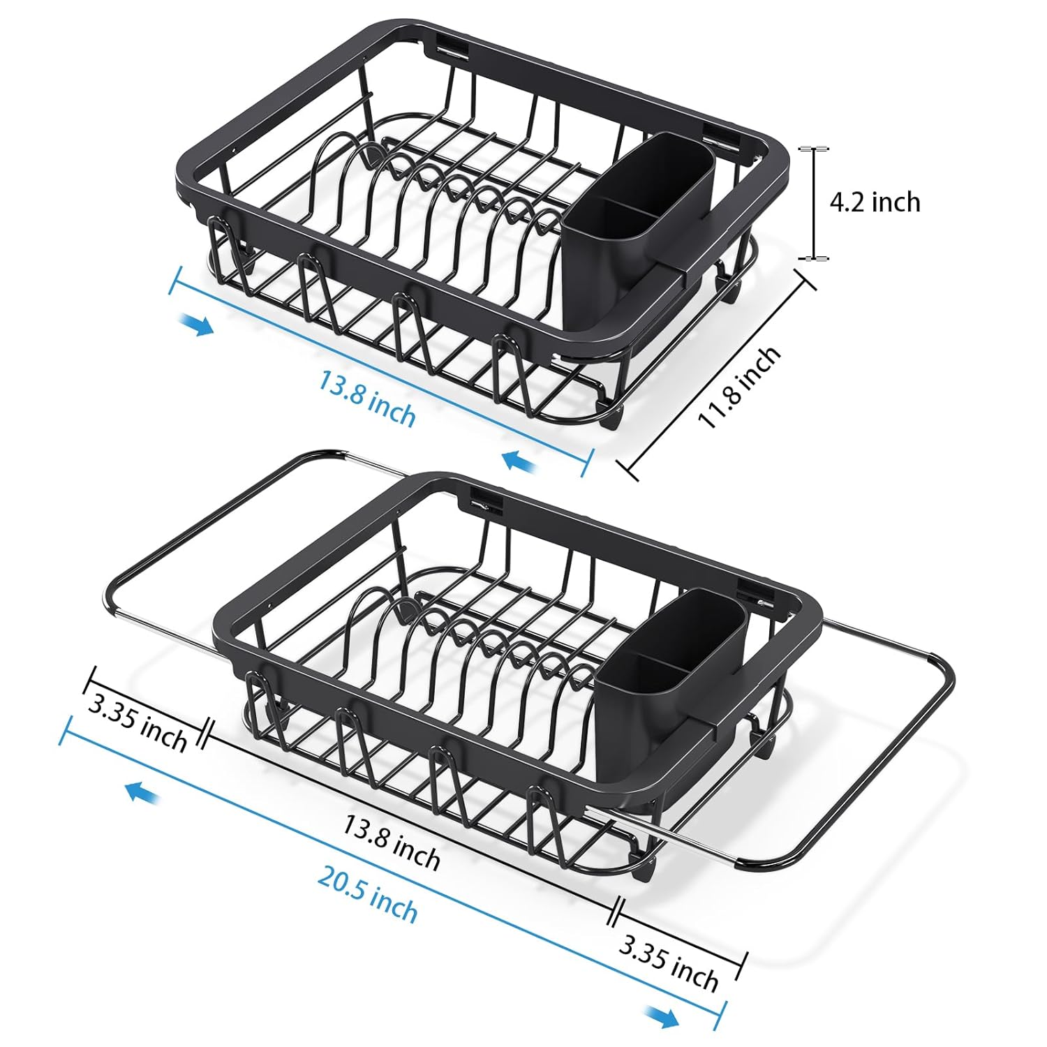 - [ EXTENDABLE & SUITABLE ] Urackify expandable over sink dish rack(collapsed) measures 13.8"(35cm) L x 11.8" (30cm) W x 4.2" H (10.7cm) , extendable from 13.8" to 20.5" length to make it handy to place over a larger sink, fit your sink which is 13.8 to 20.5 inches length.