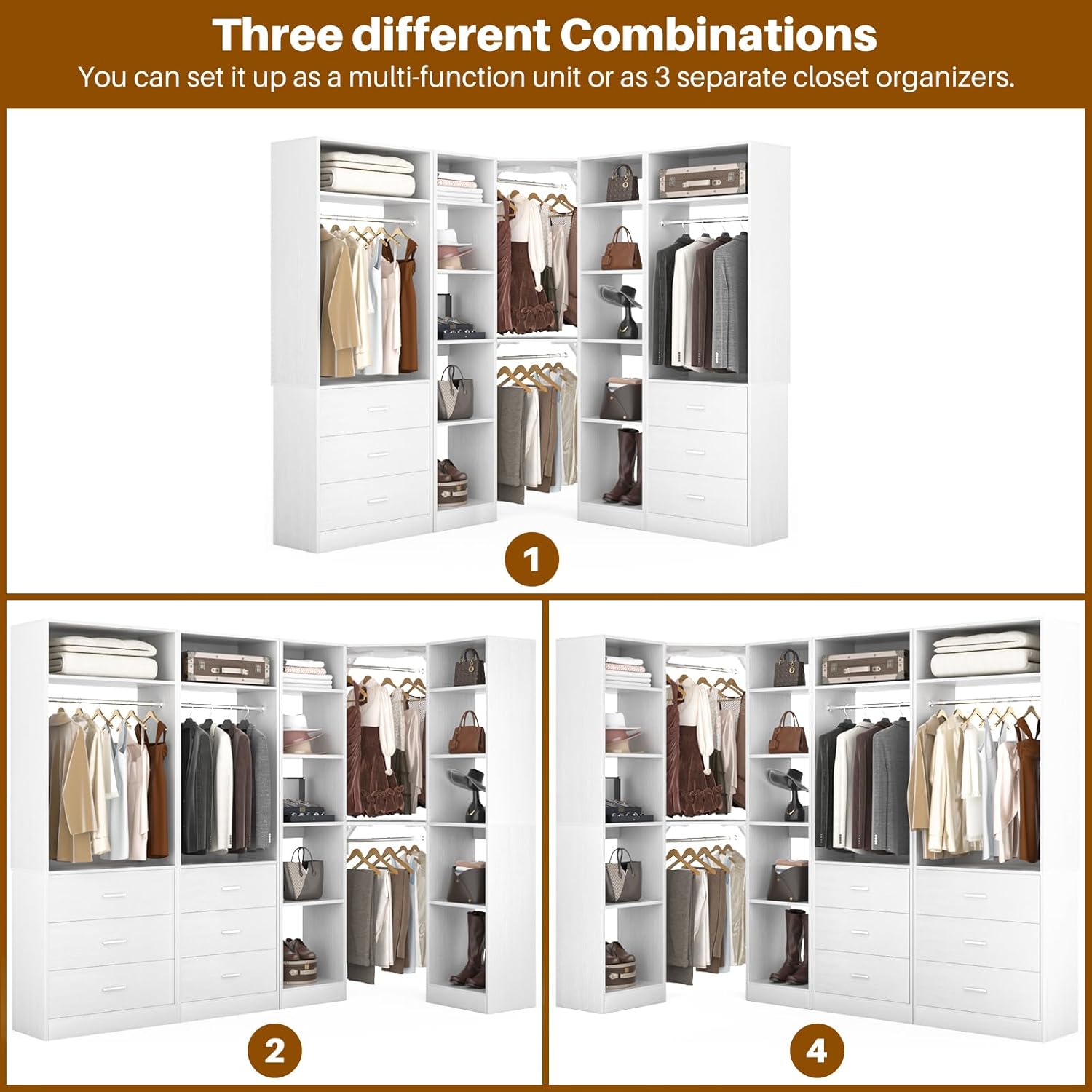 - DIY Customize Your Dream Walk-in Closet: Our closet systems put the design in your hands, allowing you to DIY to your liking. You have the flexibility to mix and match different modules based on room size, personal style and storage requirements to create an dreamful L- or U-shaped walk-in closet.