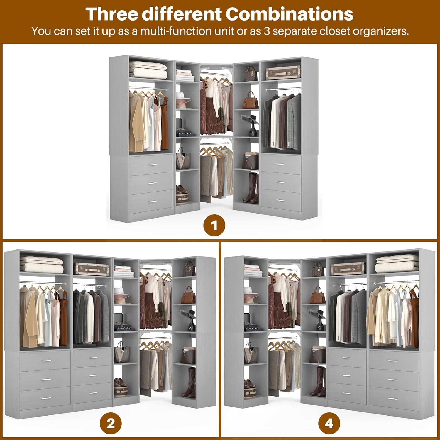 - DIY Customize Your Dream Walk-in Closet: Our closet systems put the design in your hands, allowing you to DIY to your liking. You have the flexibility to mix and match different modules based on room size, personal style and storage requirements to create an dreamful L- or U-shaped walk-in closet.