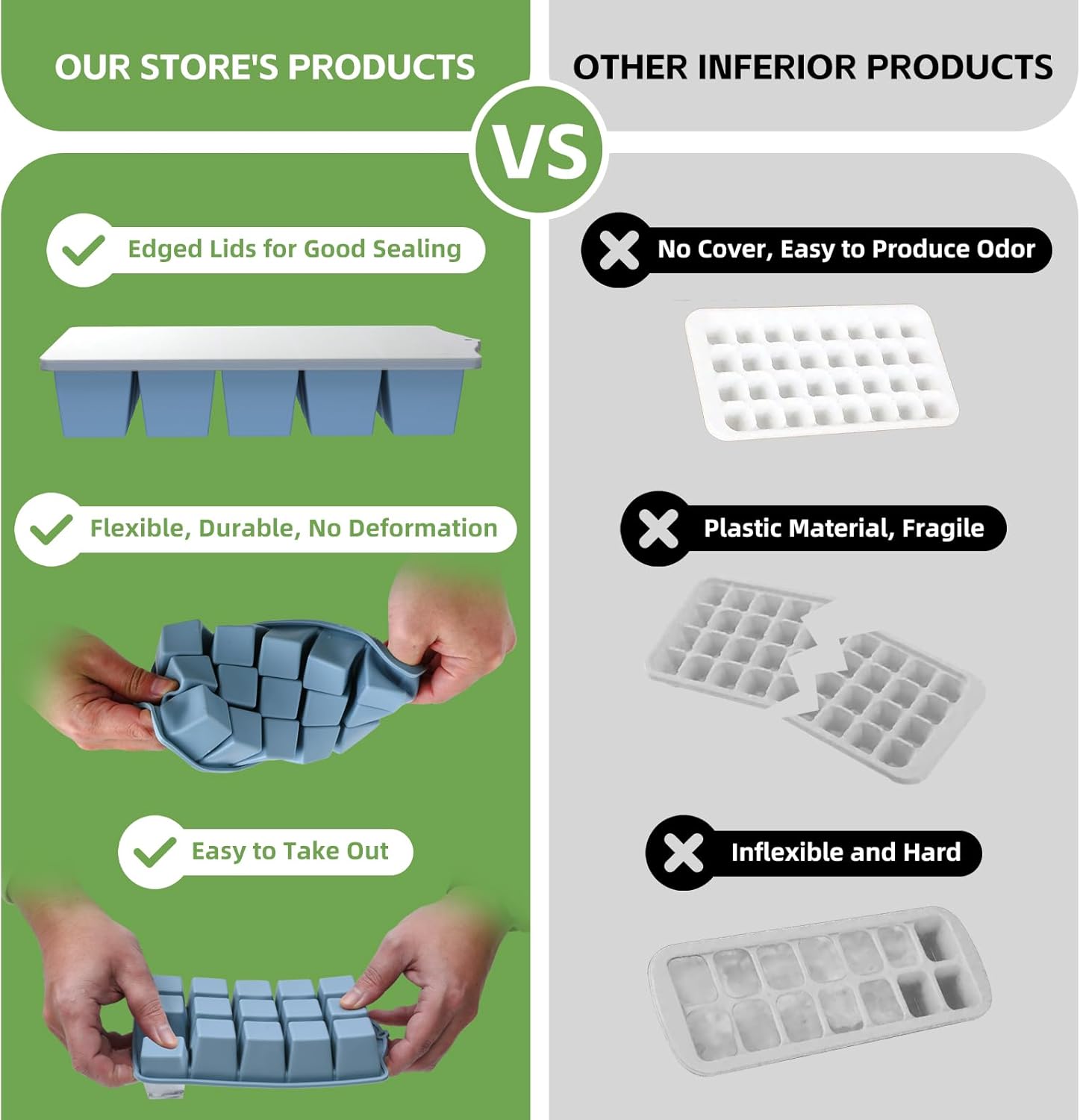 - 【Trusted Food-Grade Silicone】Safety first! Our silicone ice cube trays with lid are made from BPA-free, food-grade material.This durable material withstands extreme temps, resisting warping and odors. A must for every family! These ice cube tray silicone make clean, safe ice perfect for drinks, baby food, and snacks.