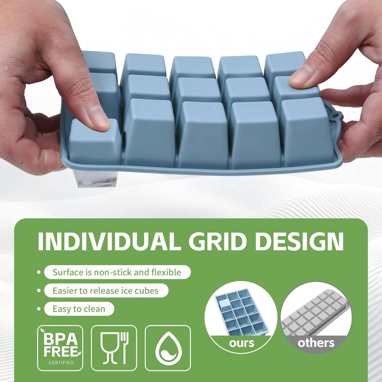Silicone Ice Cube Tray, 2 Pack Easy-Release Stackable Ice Trays for Freezer with Lid 15 Reusable Cubes, Food Grade BPA Free Ice Molds for Whiskey, Baby Food, Coffee, Cocktail, Drinks (Blue)
