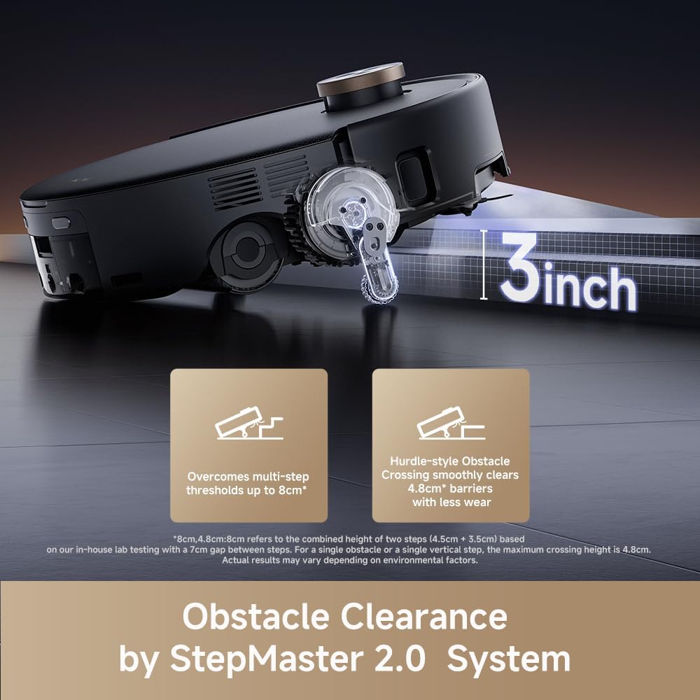 - Adaptive All-Terrain Mobility – StepMaster 2.0 with LiftPro Chassis climbs thresholds up to 8cm, while the ultra-slim 96mm design with FlexScope Navigation glides under sofas, beds, and cabinets. From high obstacles to low-clearance spaces, Z60 delivers complete room coverage without interruption.