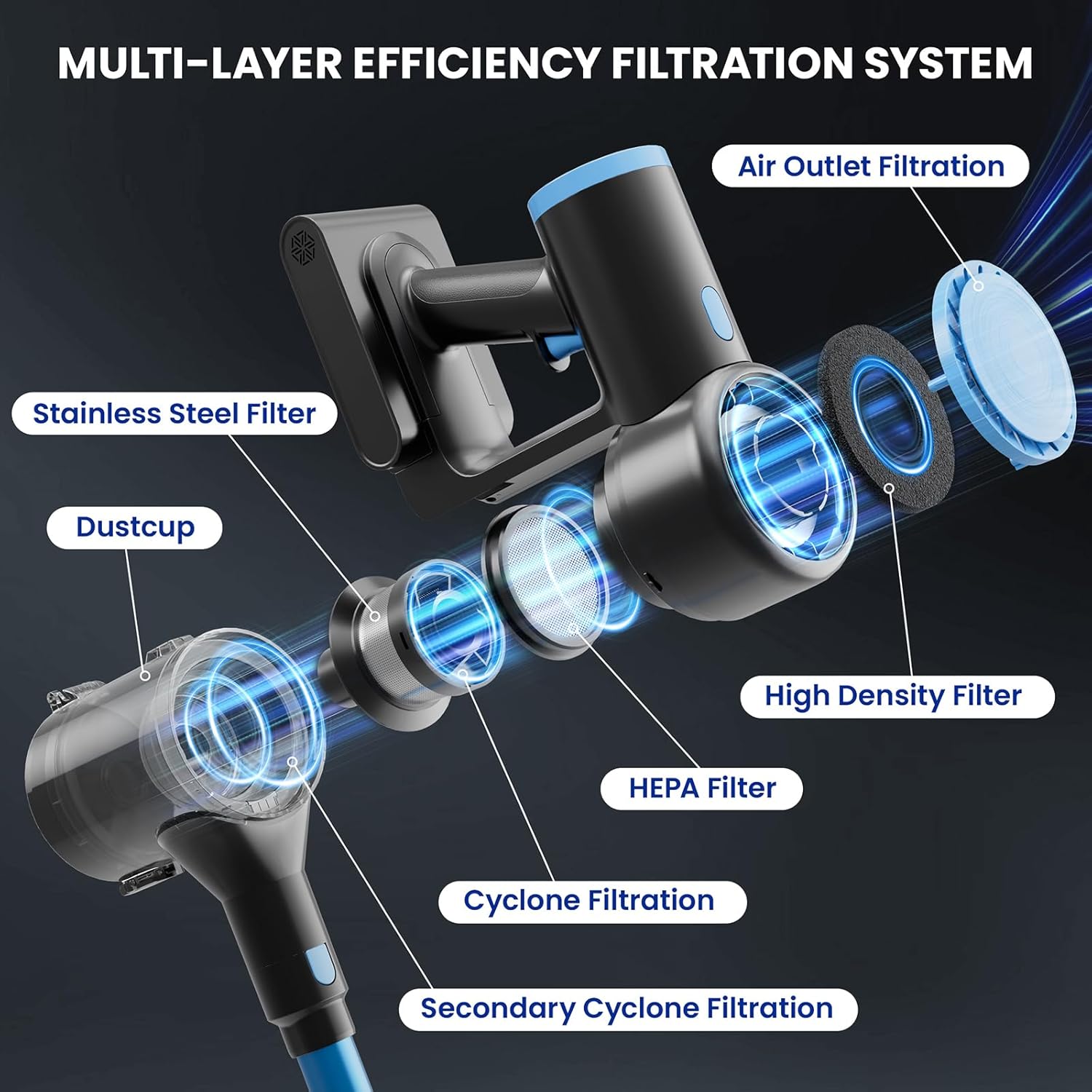 - 【Multi-Layer Filtration for Cleaner Air & Hassle-Free Disposal】This cordless vacuum cleaner features a multi-layer sealed cyclone filtration system that efficiently captures fine dust using a high-performance HEPA filter, locking debris securely in the dust cup. The bottom-release dustbin allows one-touch, hands-free emptying—making cleaning more convenient, hygienic, and mess-free.