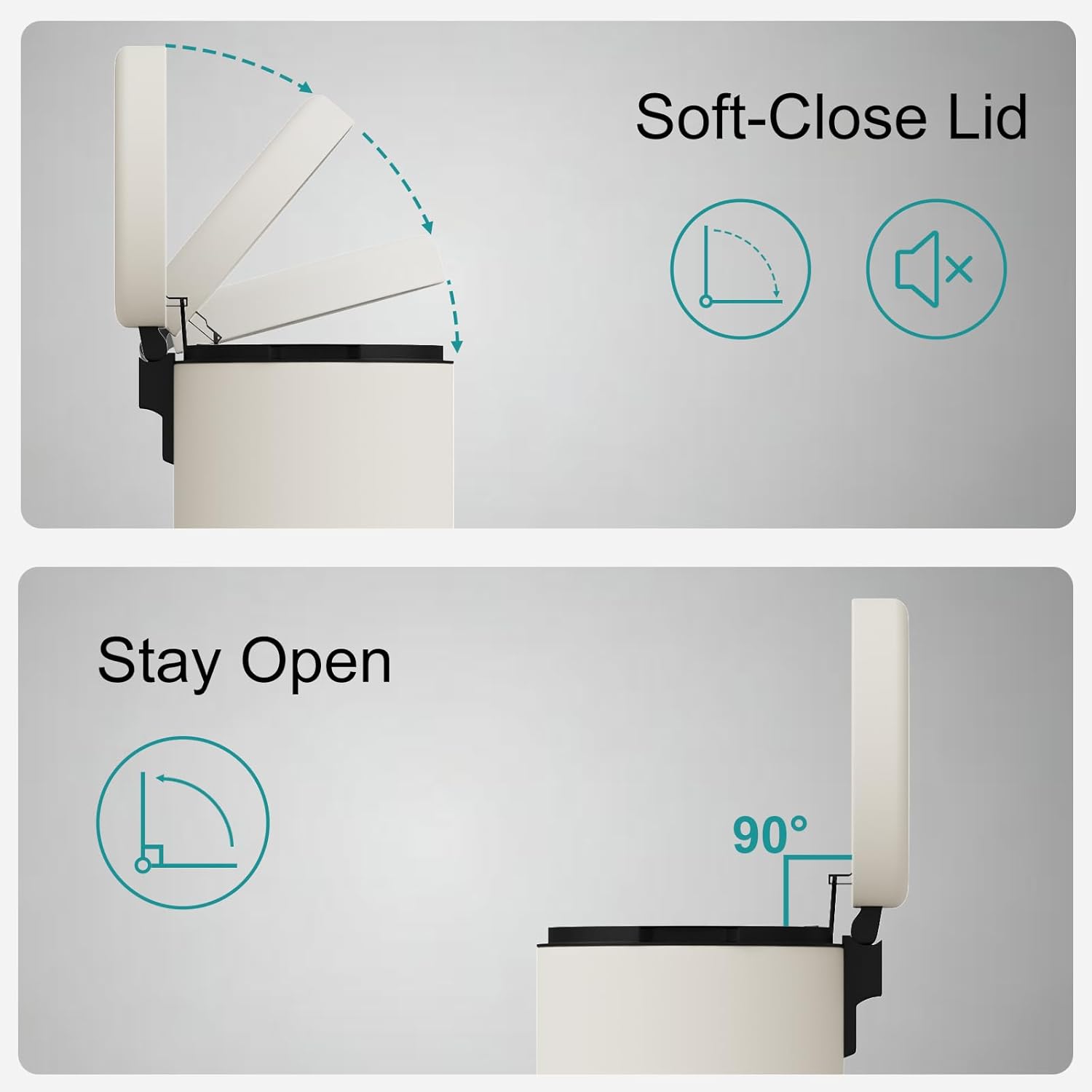 - 【Noiseless Soft-Close Mechanism】Say goodbye to disruptive bangs! The gentle, silent-closing lid operates smoothly, staying open at a 90-degree angle for touch-free use while effectively sealing in odors—ideal for kitchens or office spaces.